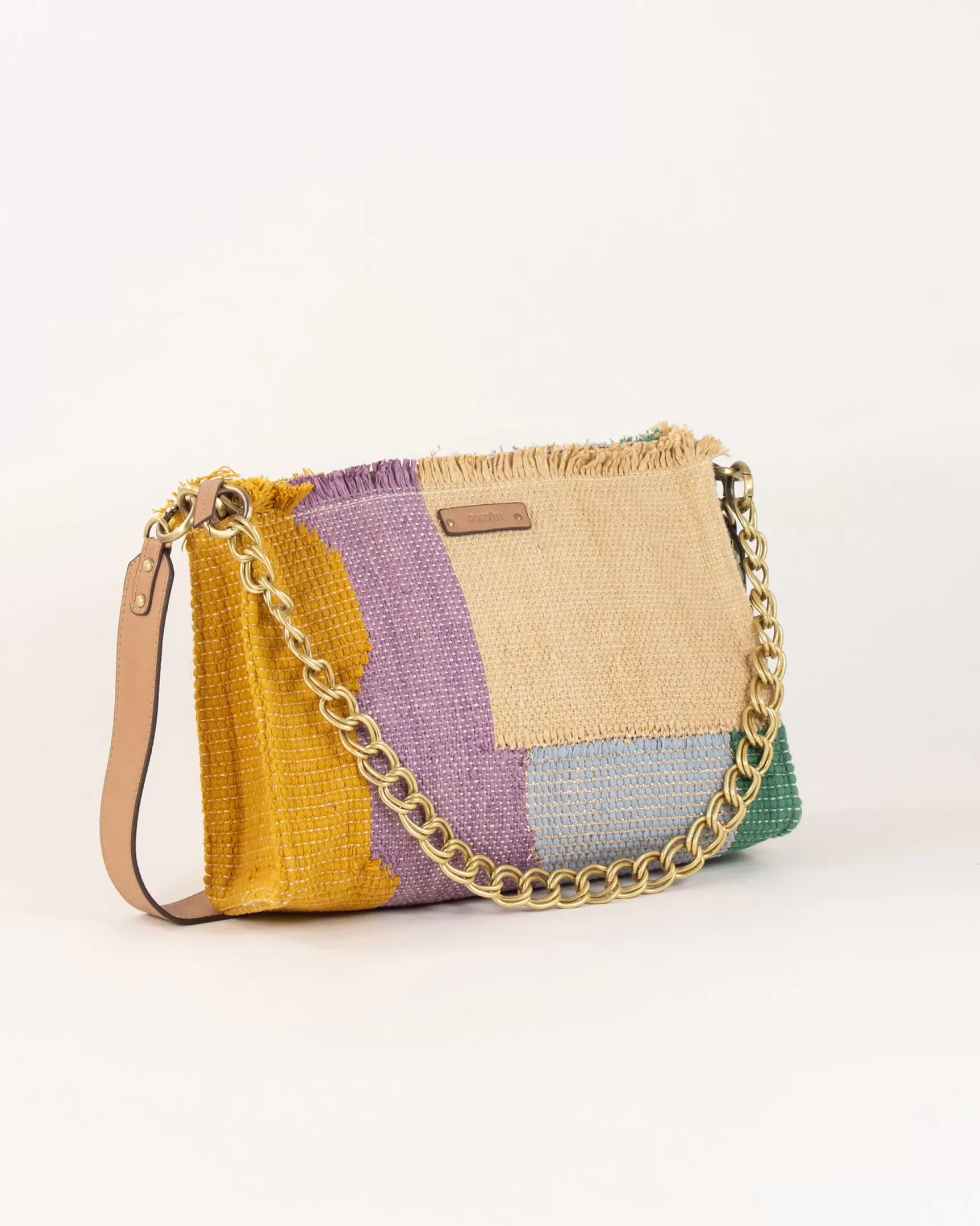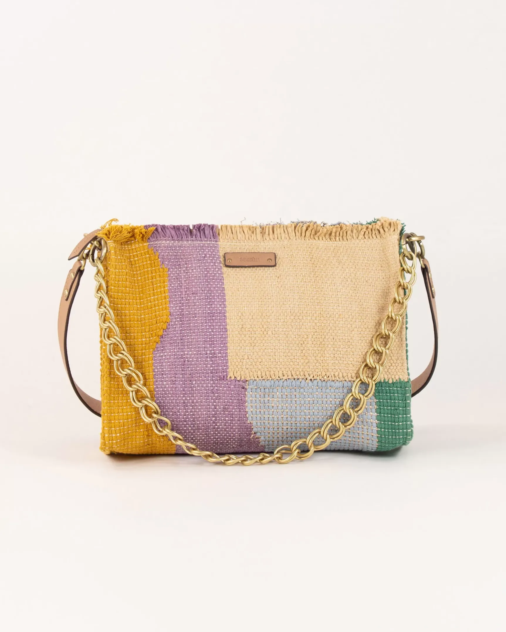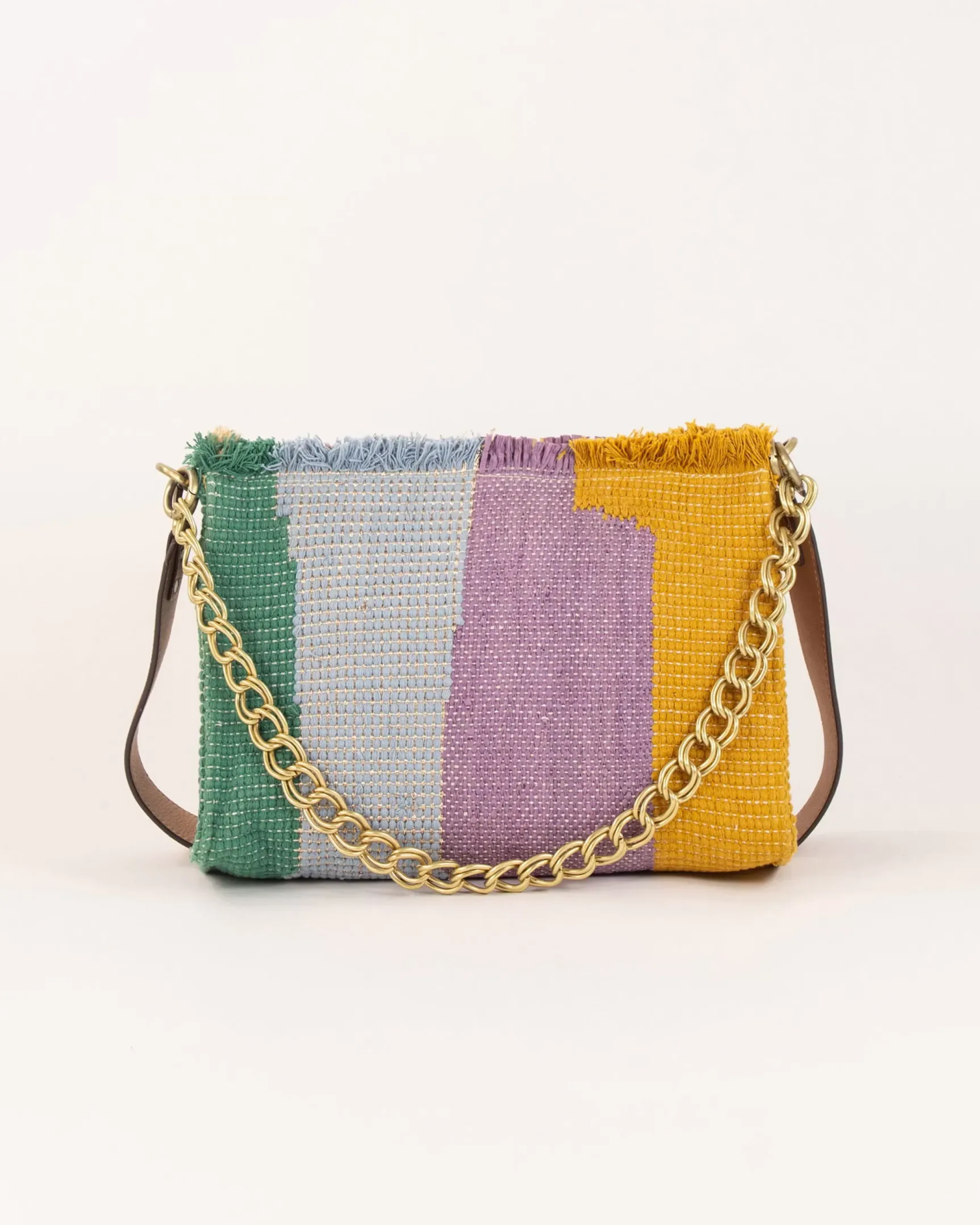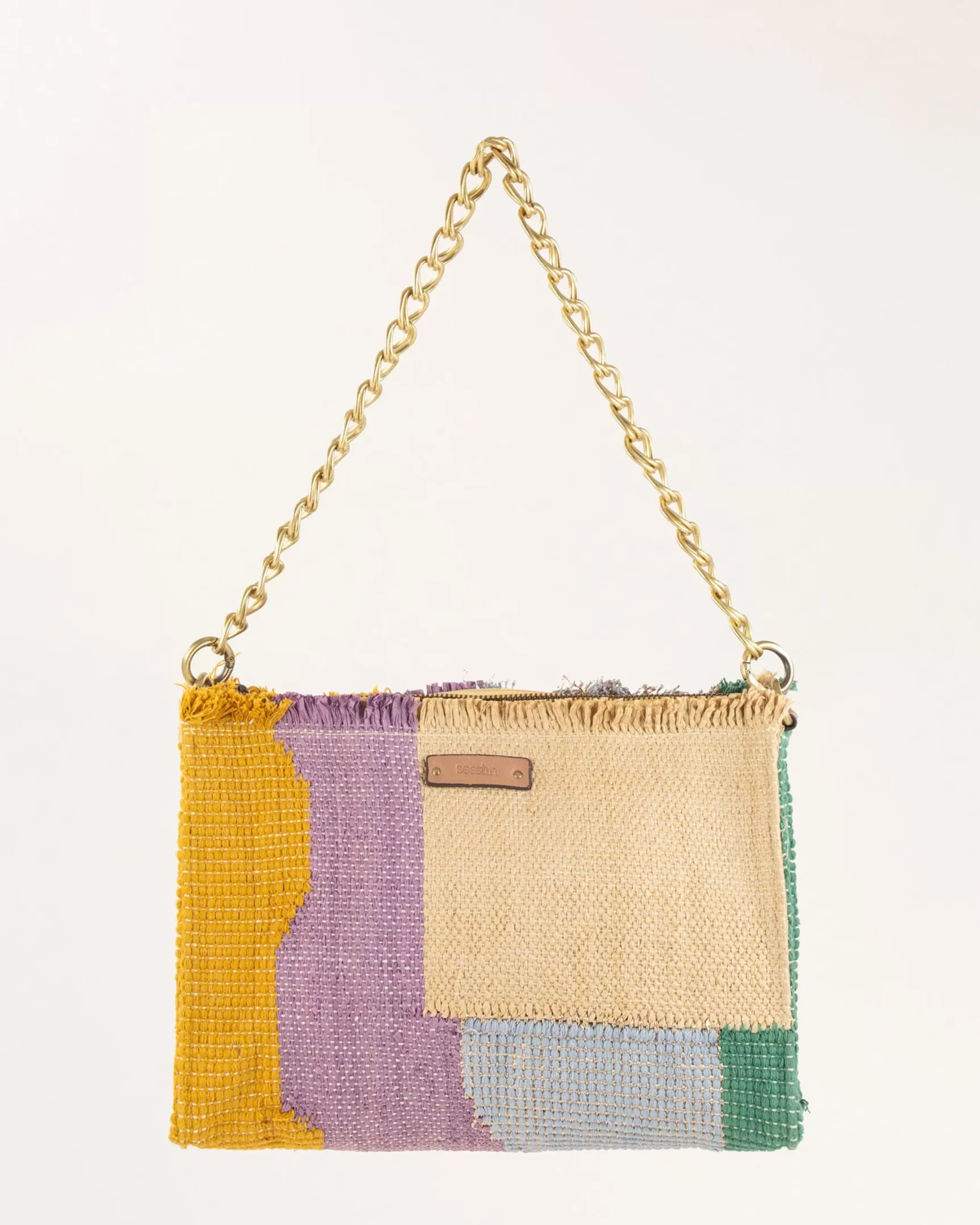 Sac pochette en tissage fantaisie coton motif exclusif Sessùn, anse chaine bijou et anse cuir.