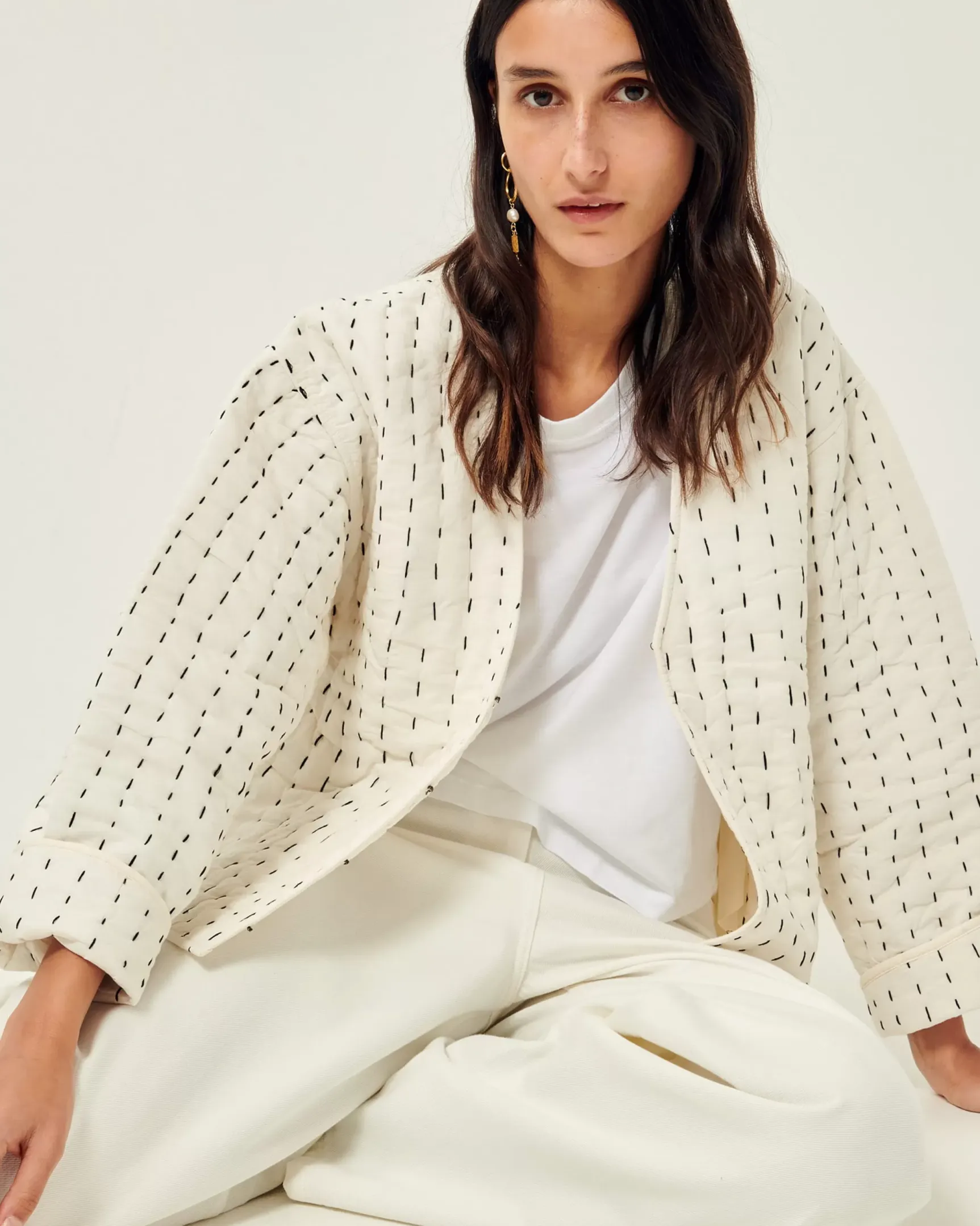 Veste ronde sans col en voile de coton matelassé teint en plongée, surpiqûres contrastées esprit boutis réalisées à la main.
