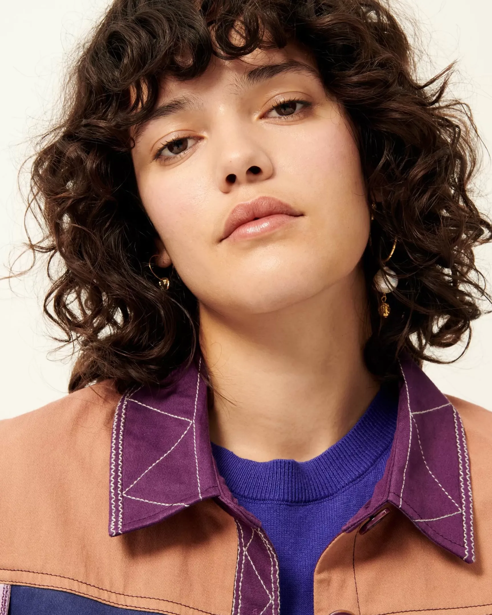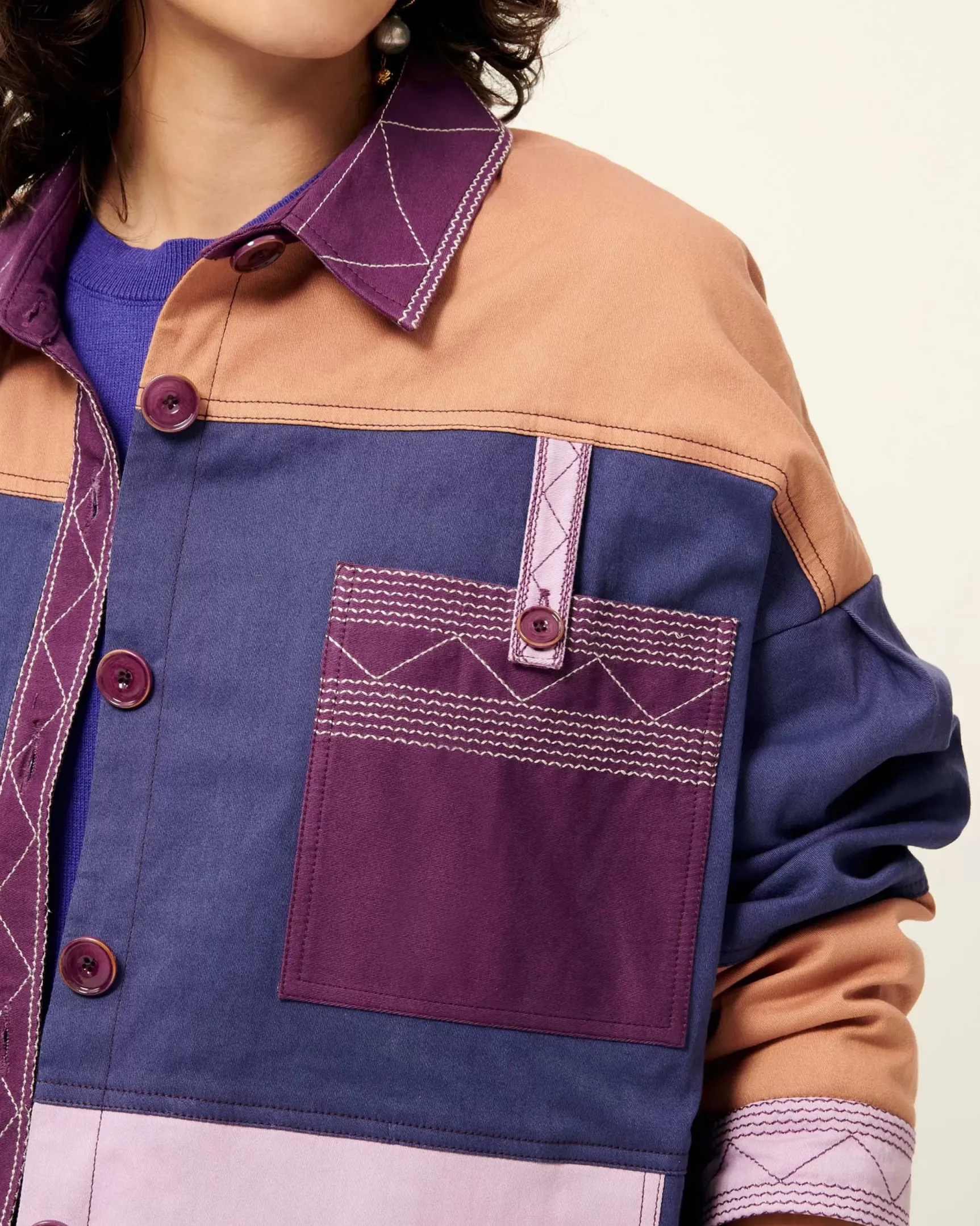 Veste esprit worker en patchwork de toiles sergés colorées, frises brodées surpiquées contrastées en détail, motif exclusif Sessùn.