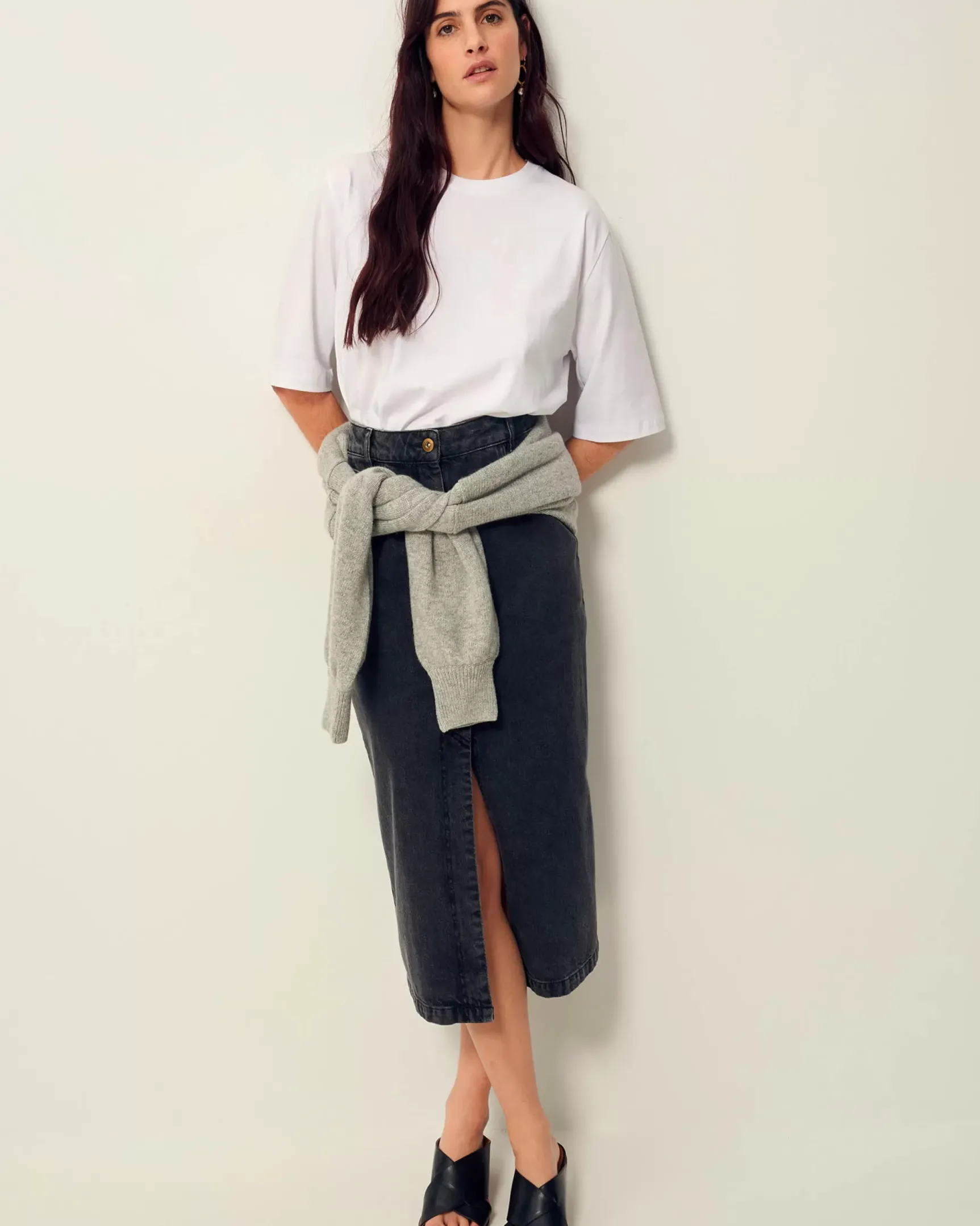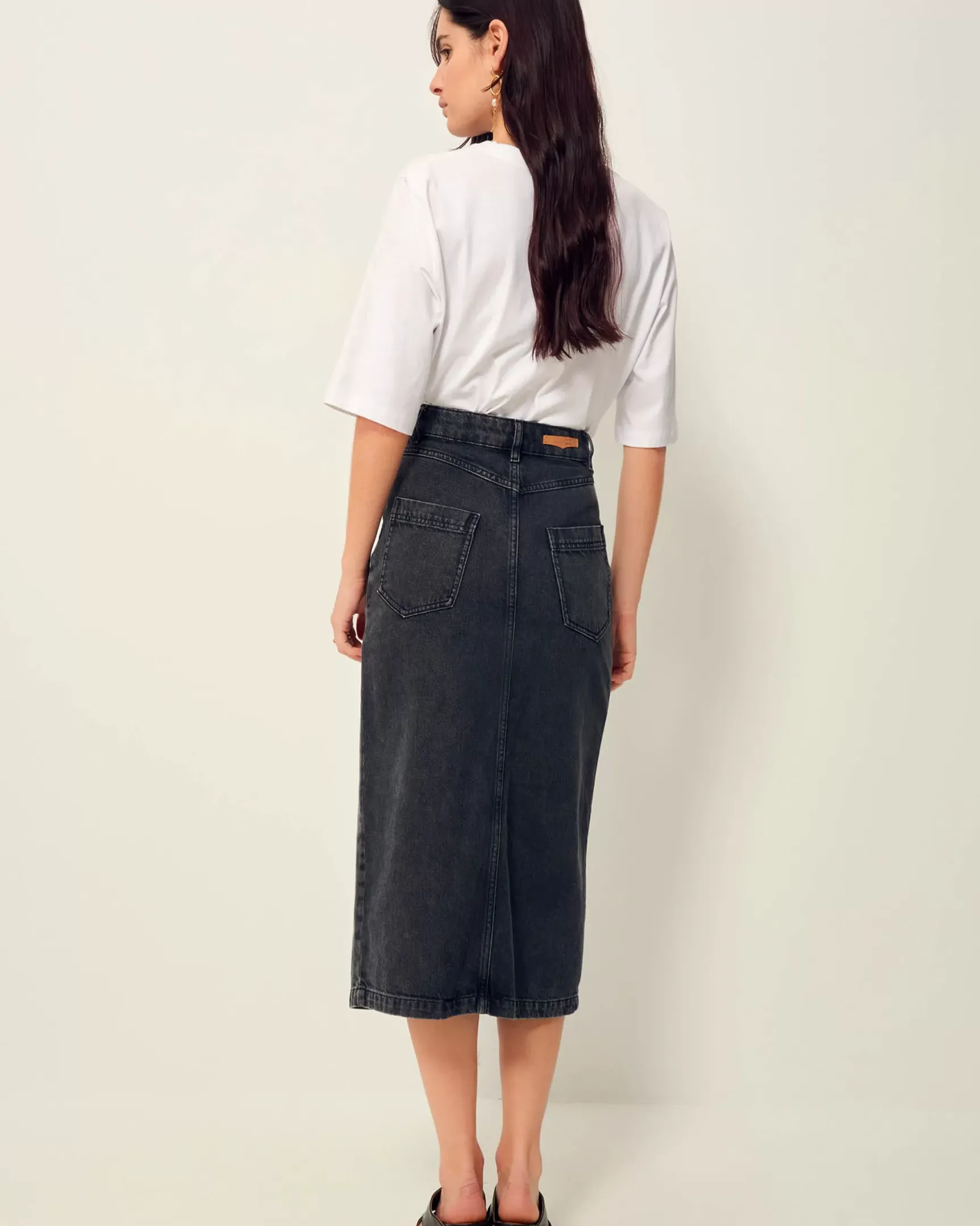 Jupe droite mi-longue ouverte sur le devant en denim stonewashé.