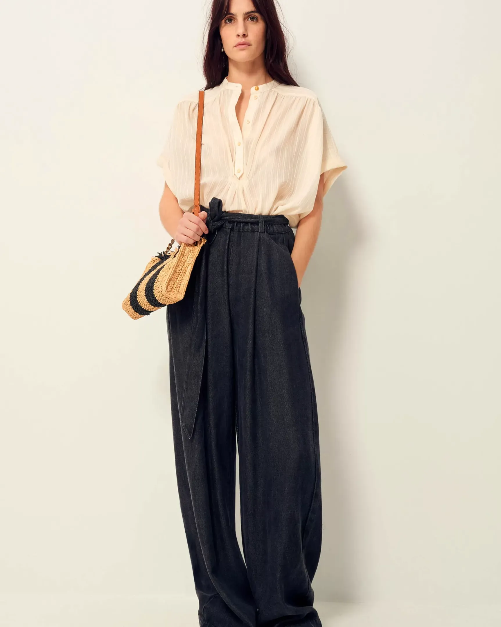 Chemisier manches courtes froncé en linon antique à fines rayures jacquard tissé en France, exclusif Sessùn.