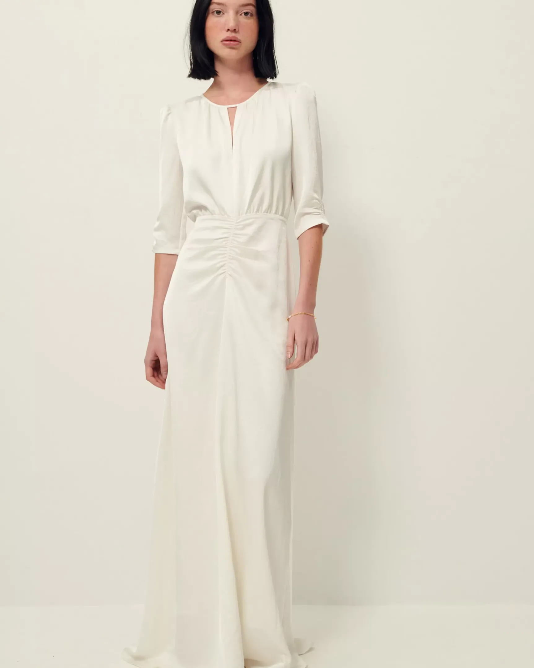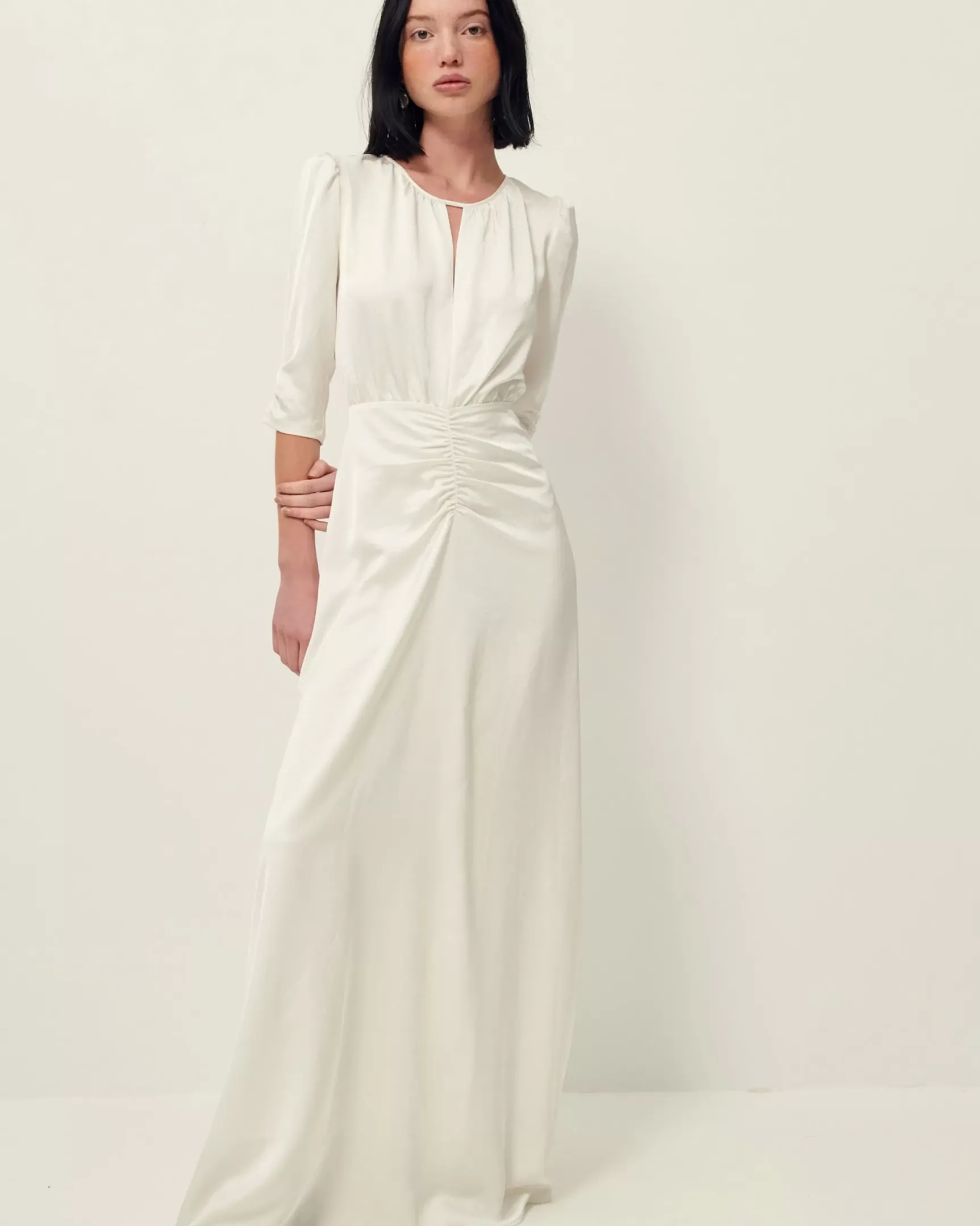 Fermeture boutonnée en bas du dos par bouton recouvert dans la matière et bouton bijoux à l’encolure.