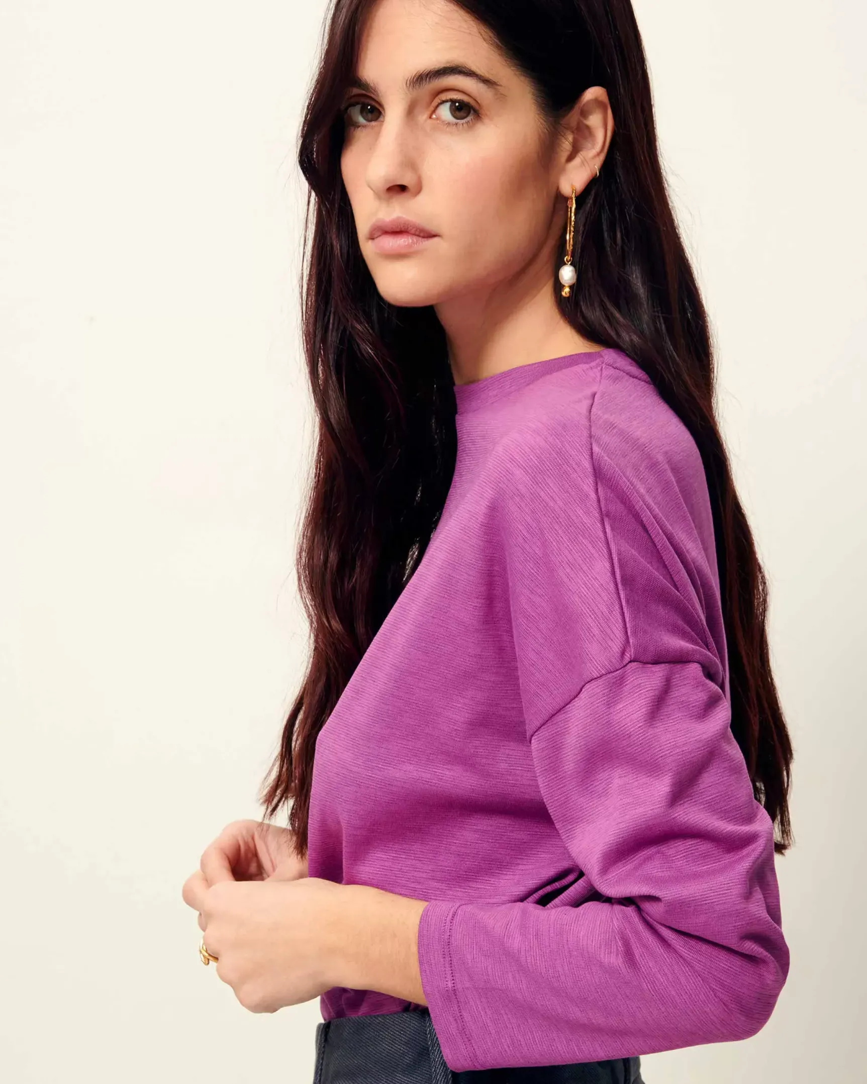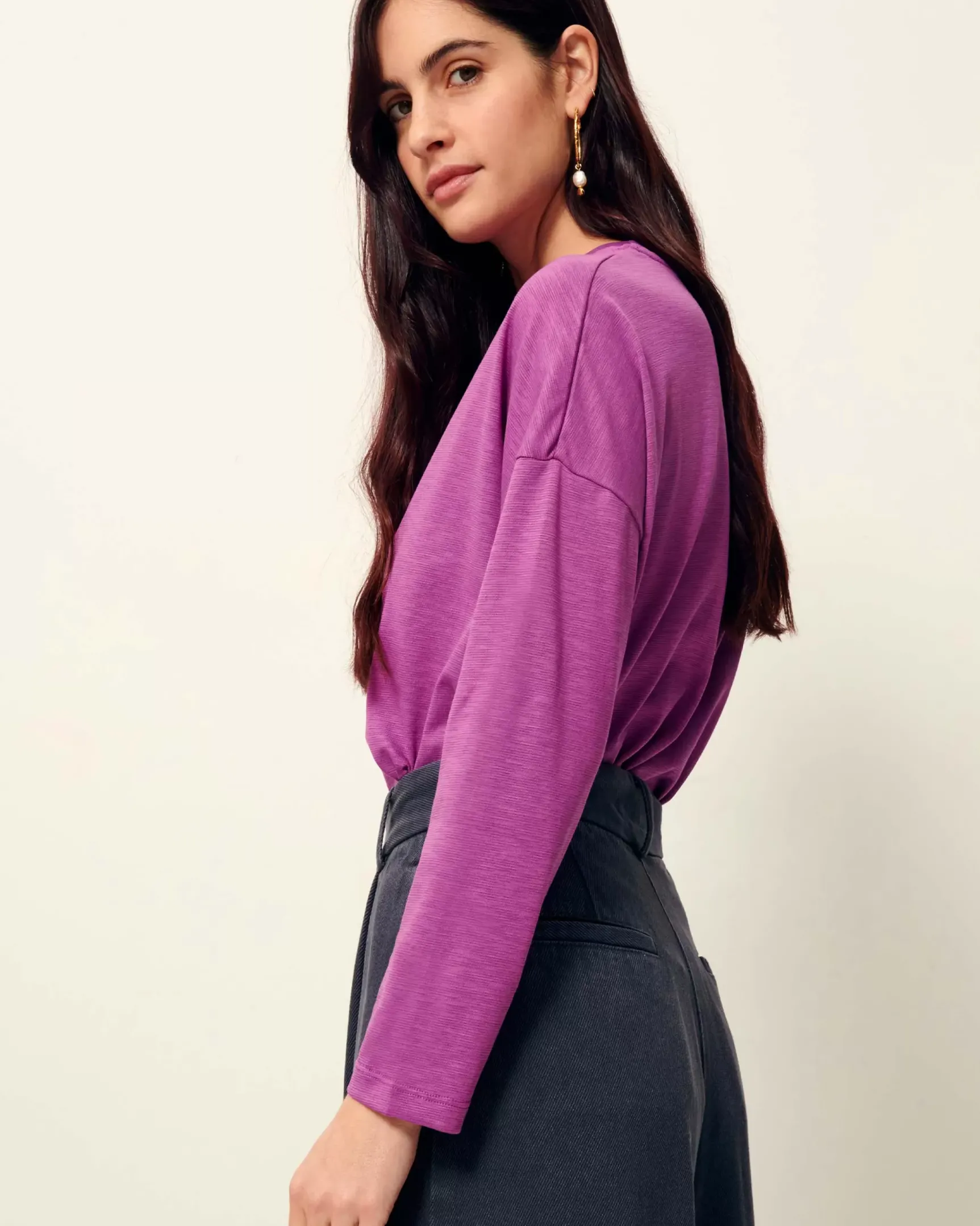 T-shirt manches longues à emmanchures basses en jersey flammé confectionné au Portugal.