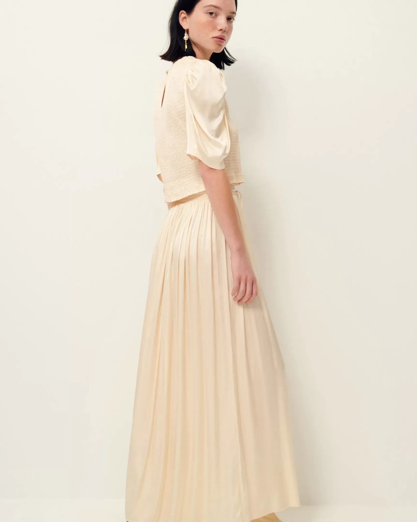 Jupon mi-long smocké en satin fluide.