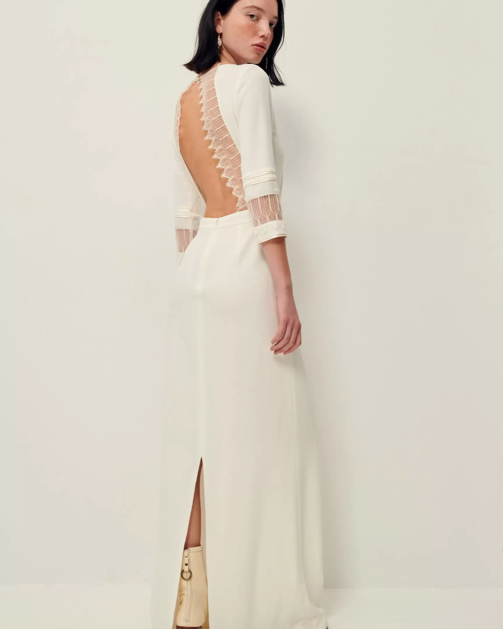 Fermeture par un bouton sur l’encolure recouvert dans la matière et un zip invisible dos.