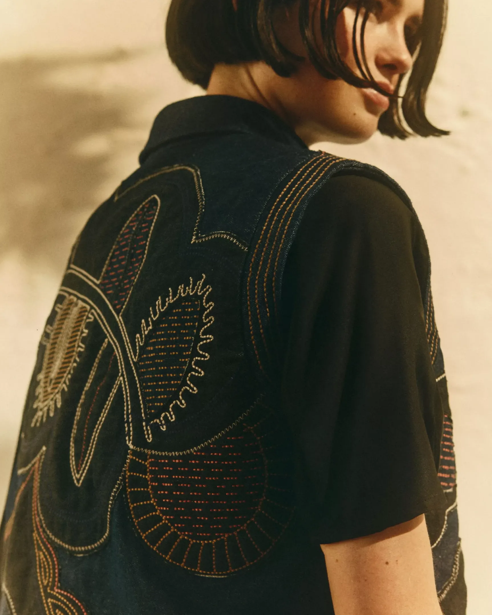 Veste courte sans manches en denim, illustrations en patchwork de denims contrastés et rebrodés de points fantaisie colorés, exclusive Sessùn.