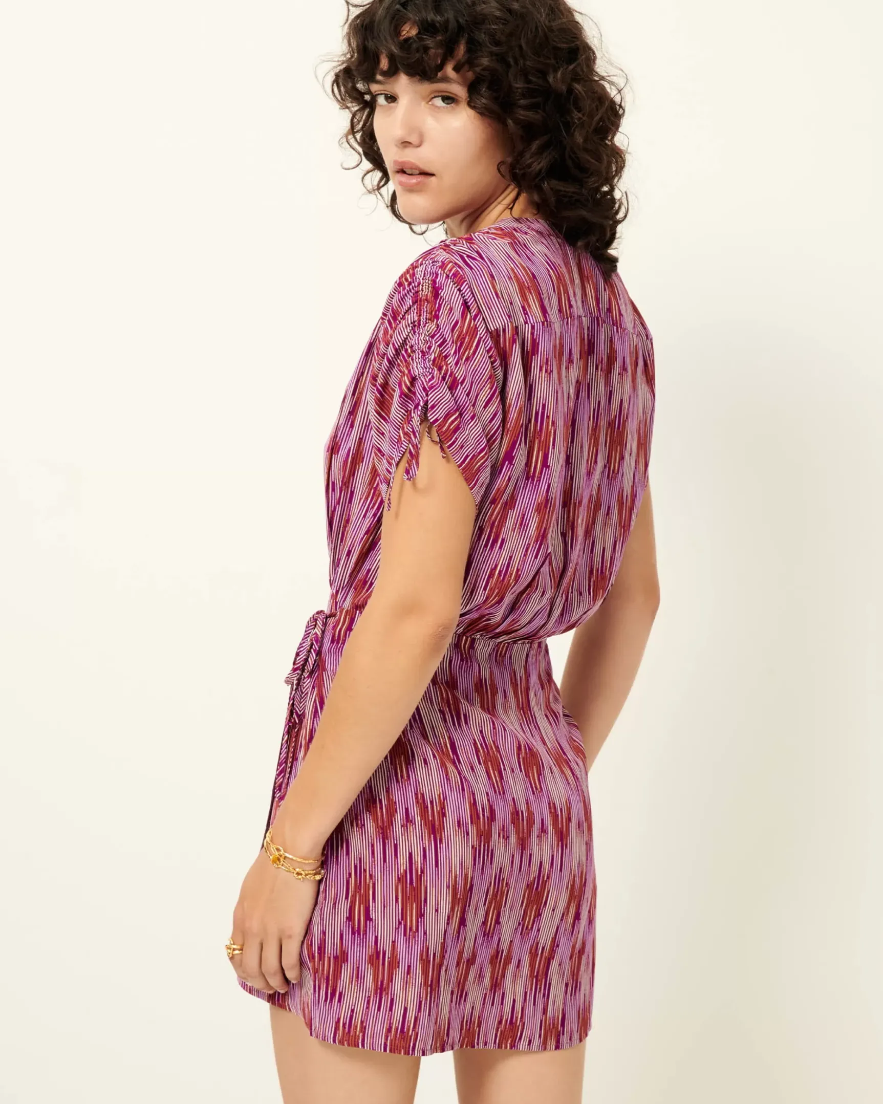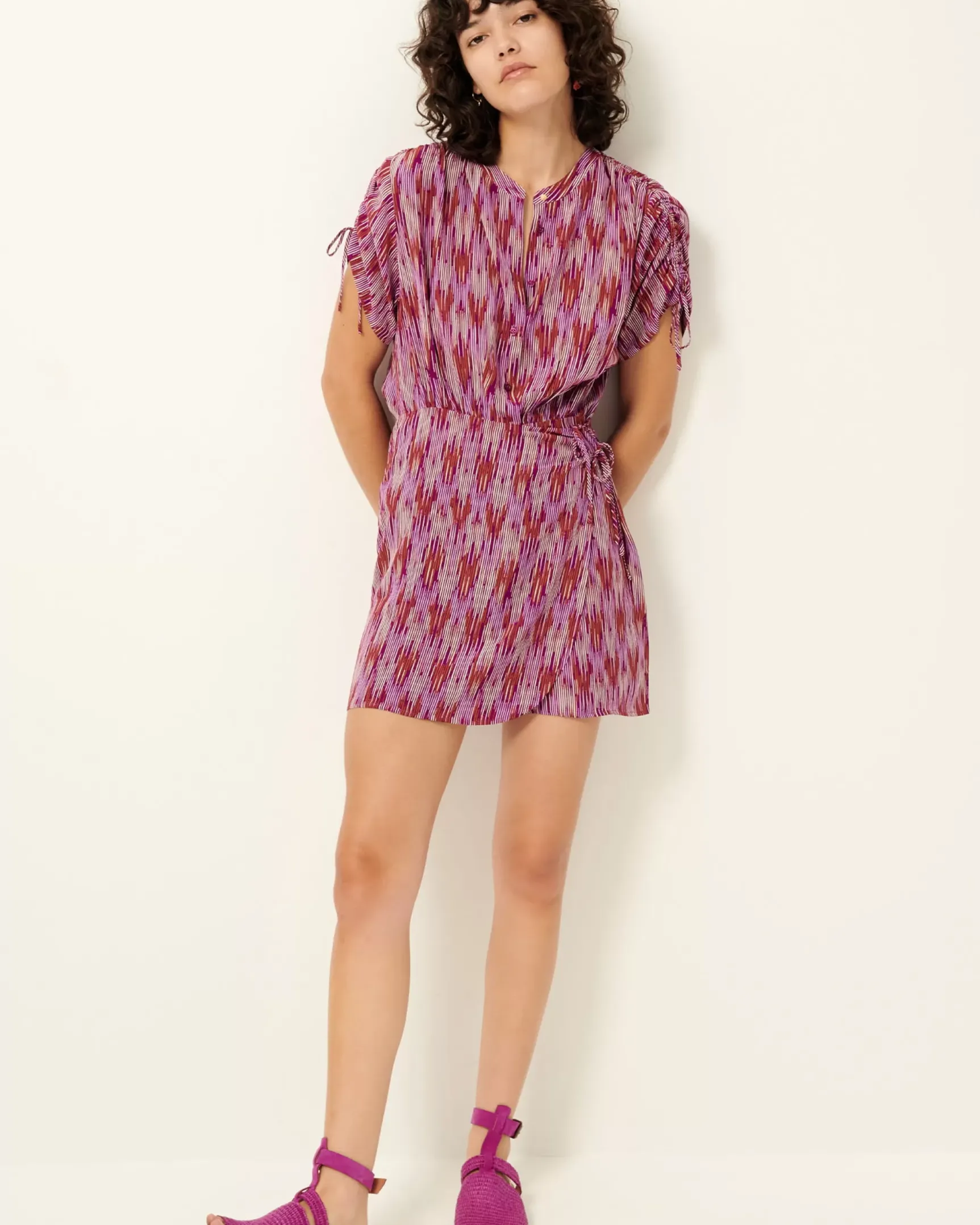 Robe courte avec liens et fronces aux épaules en toile de viscose fluide et aérienne imprimée, motif exclusif Sessùn.