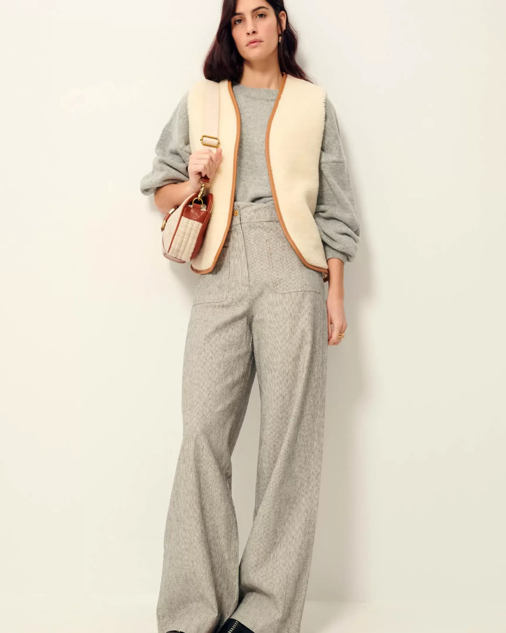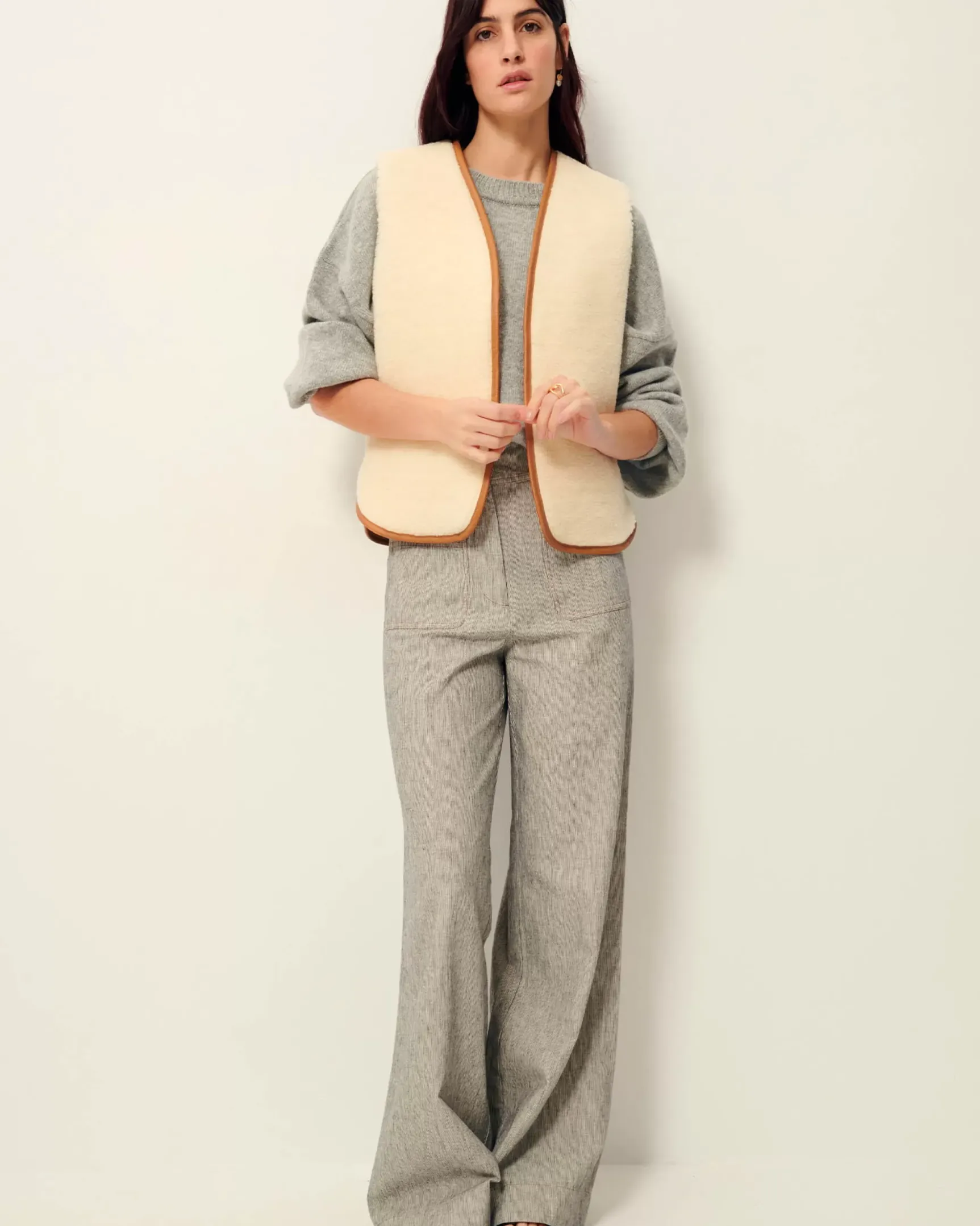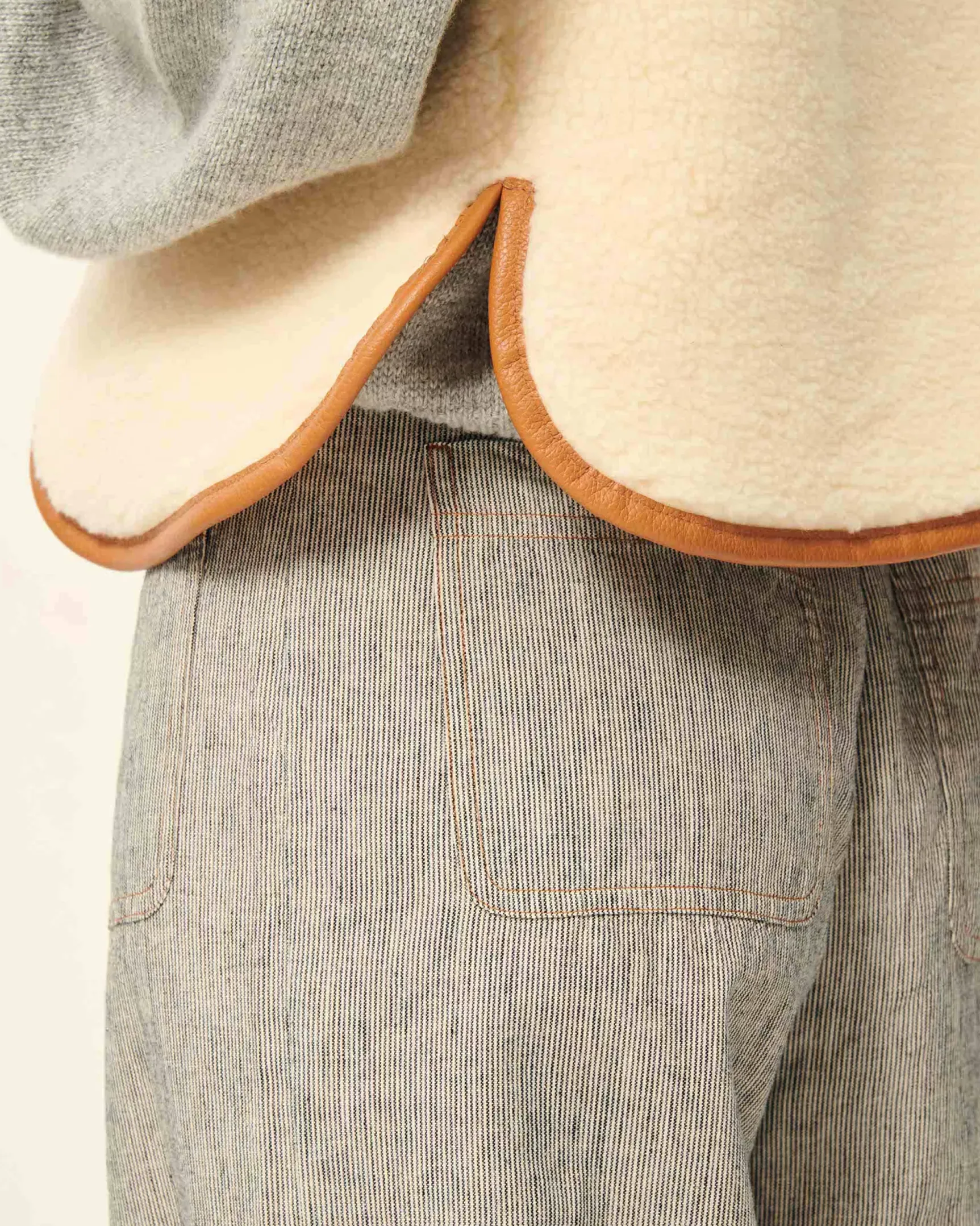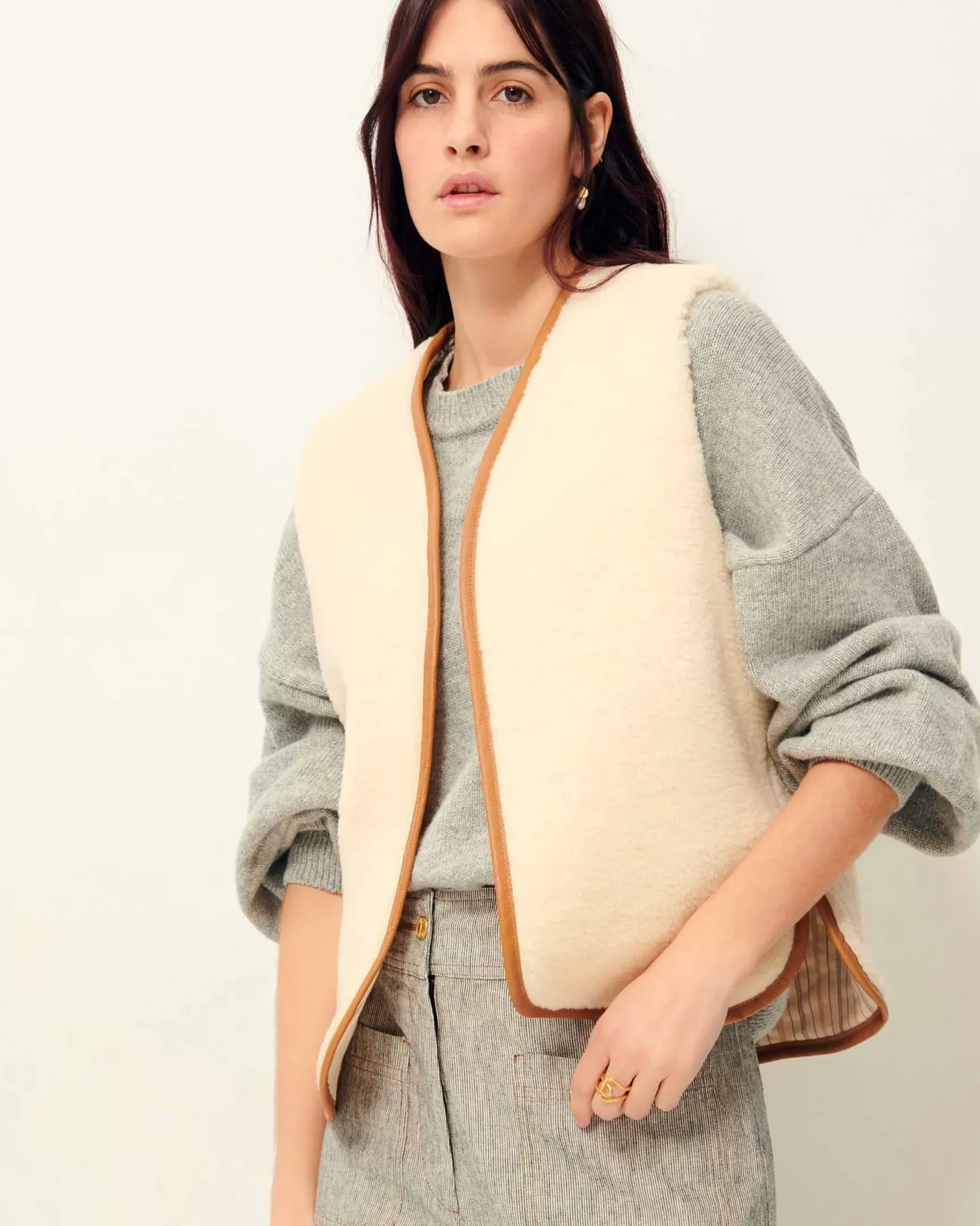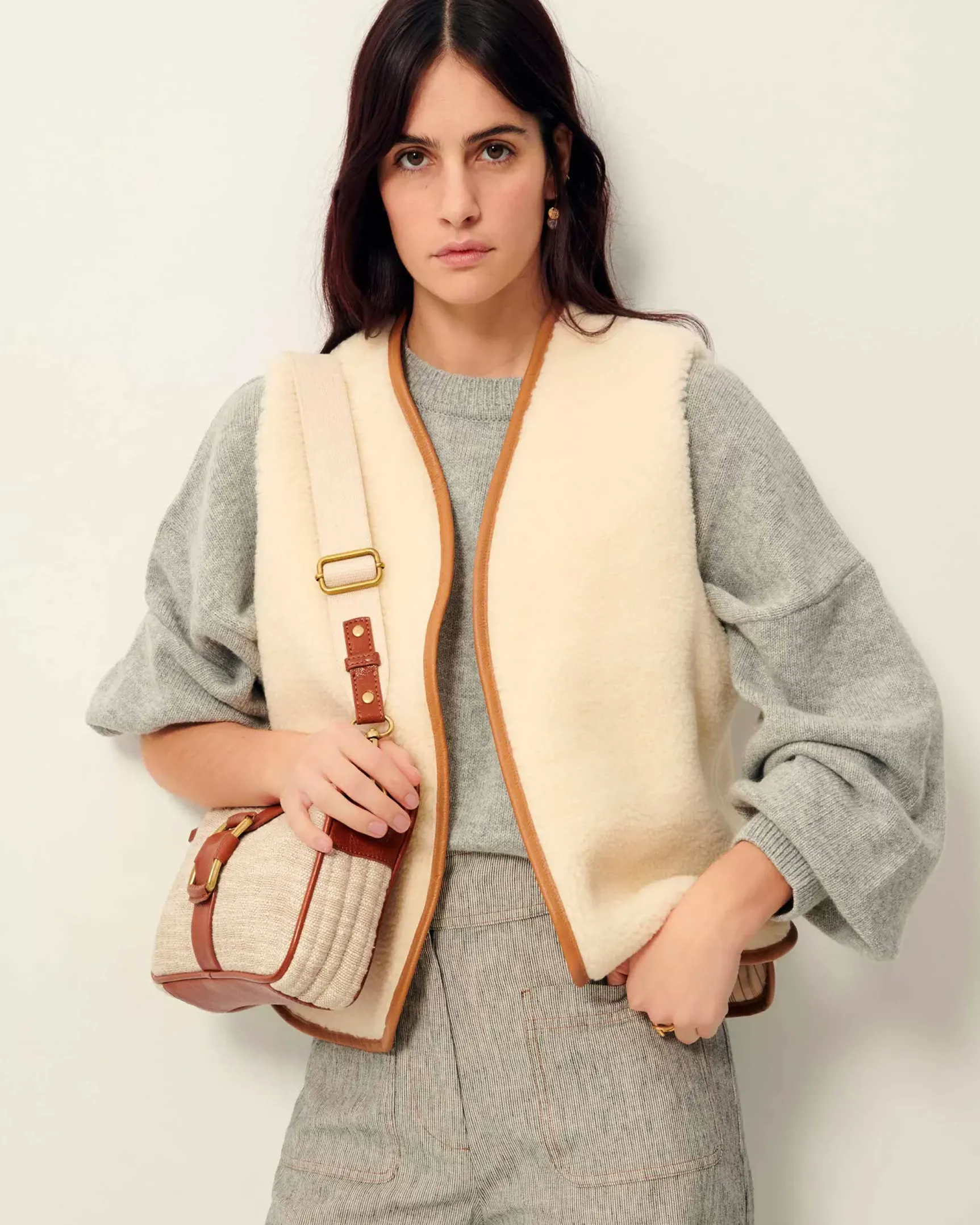 Gilet sans manches en laine de mouton tricotée façon fourrure, biaisé de cuir.