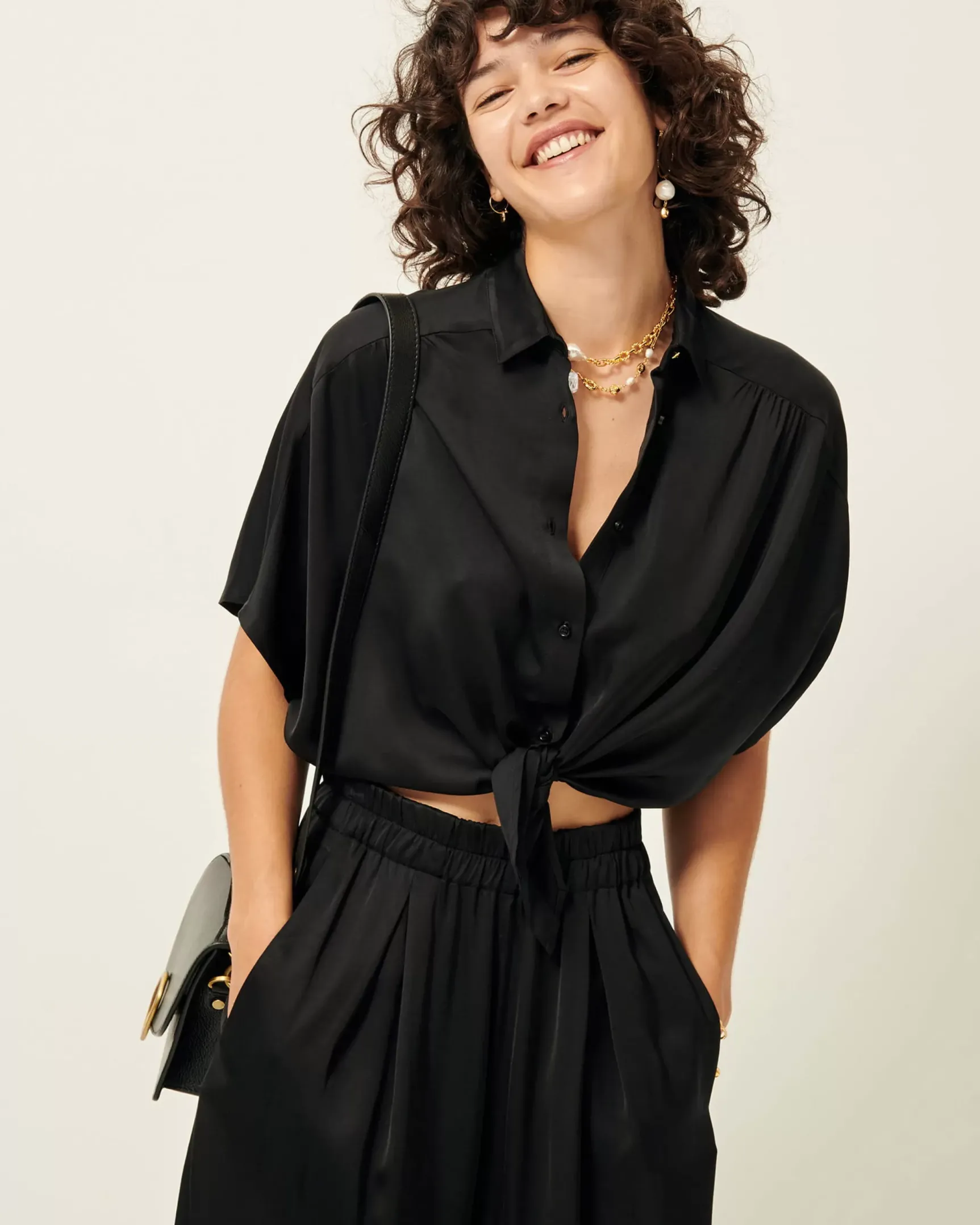 Chemise courte nouée en satin fluide de viscose.