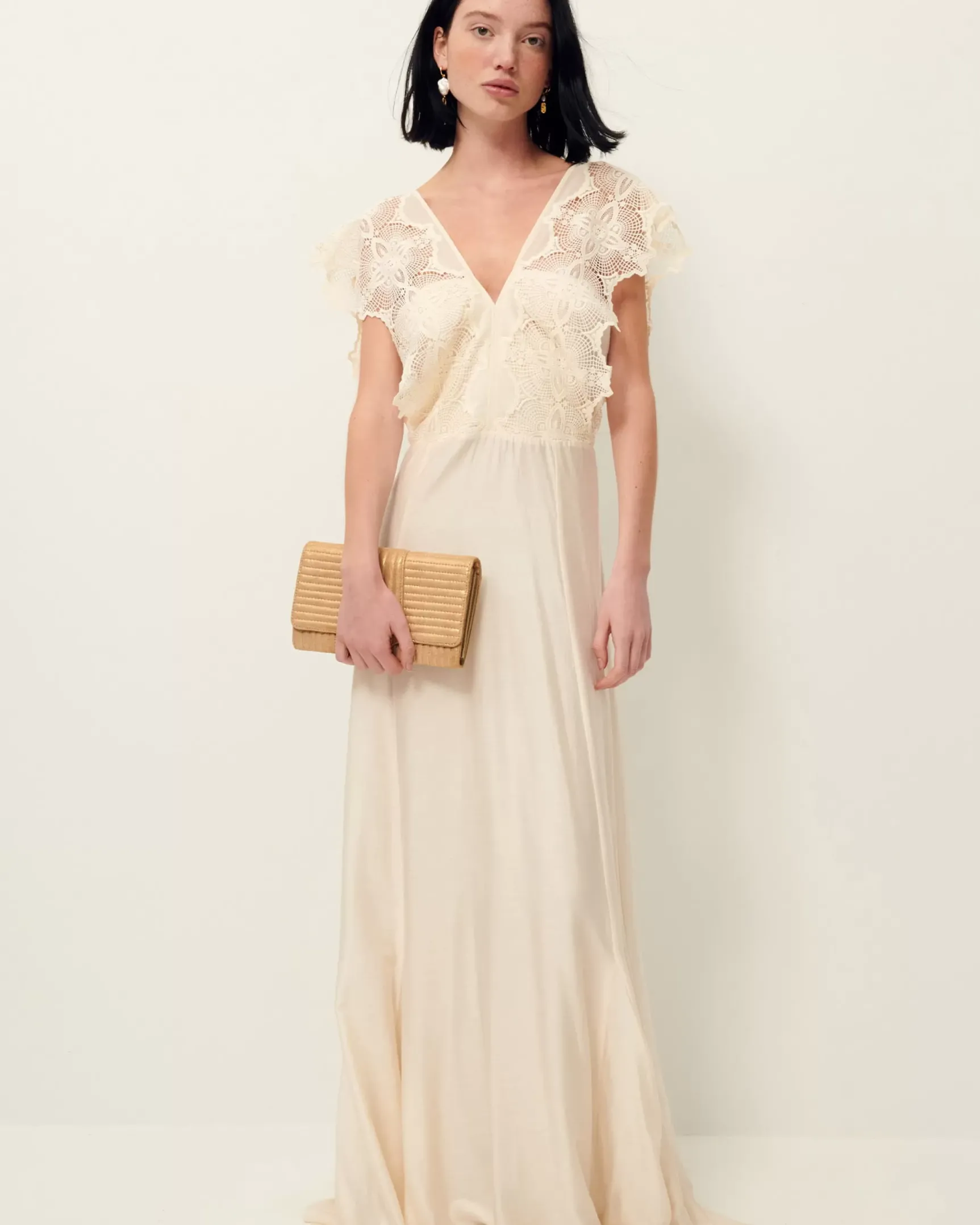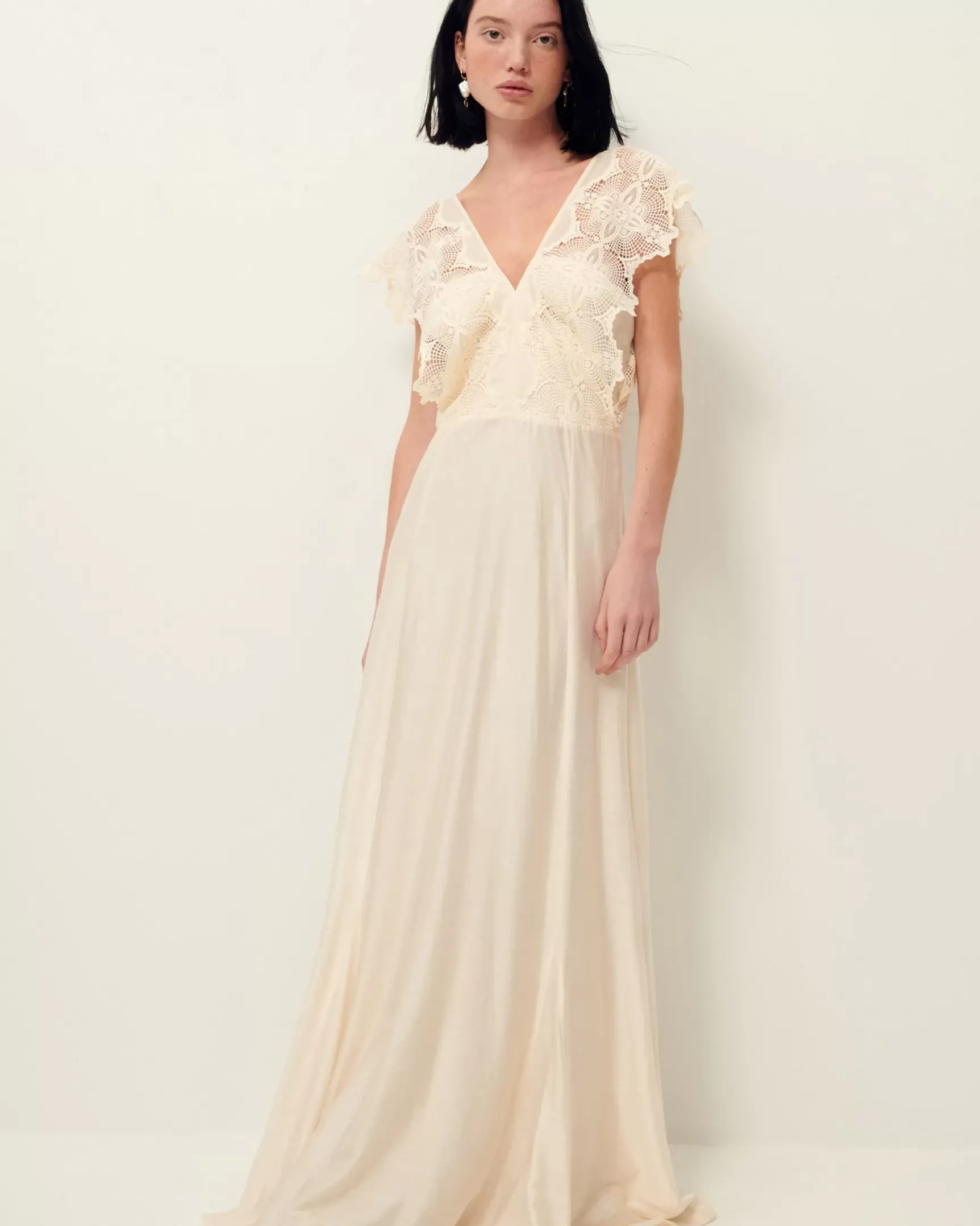 Robe longue sans manches en voilage fantaisie tissé en Allemagne et haut en galons de dentelle.