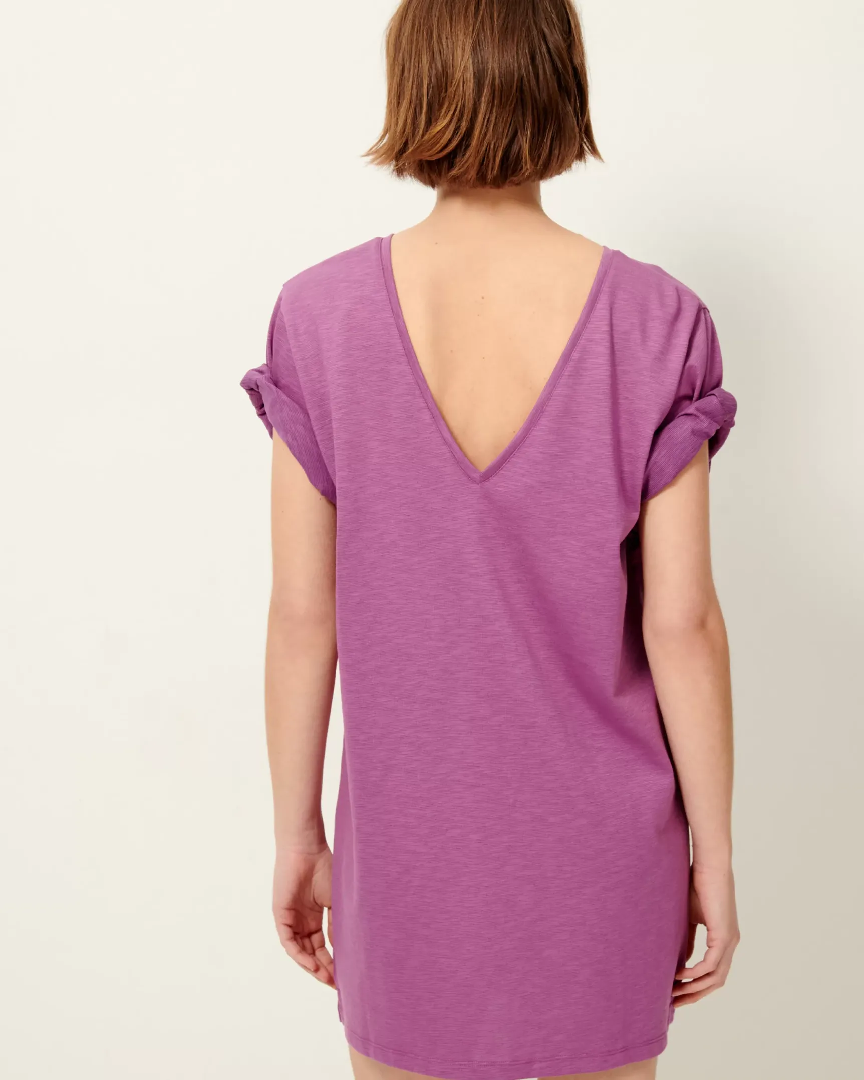 Robe tee-shirt oversize manches 3/4 et encolure V au dos en jersey flammé, confectionnée au Portugal.