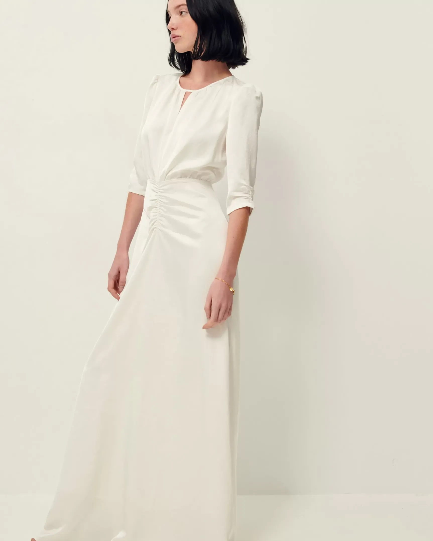 Robe longue froncée ouverte au dos en satin.