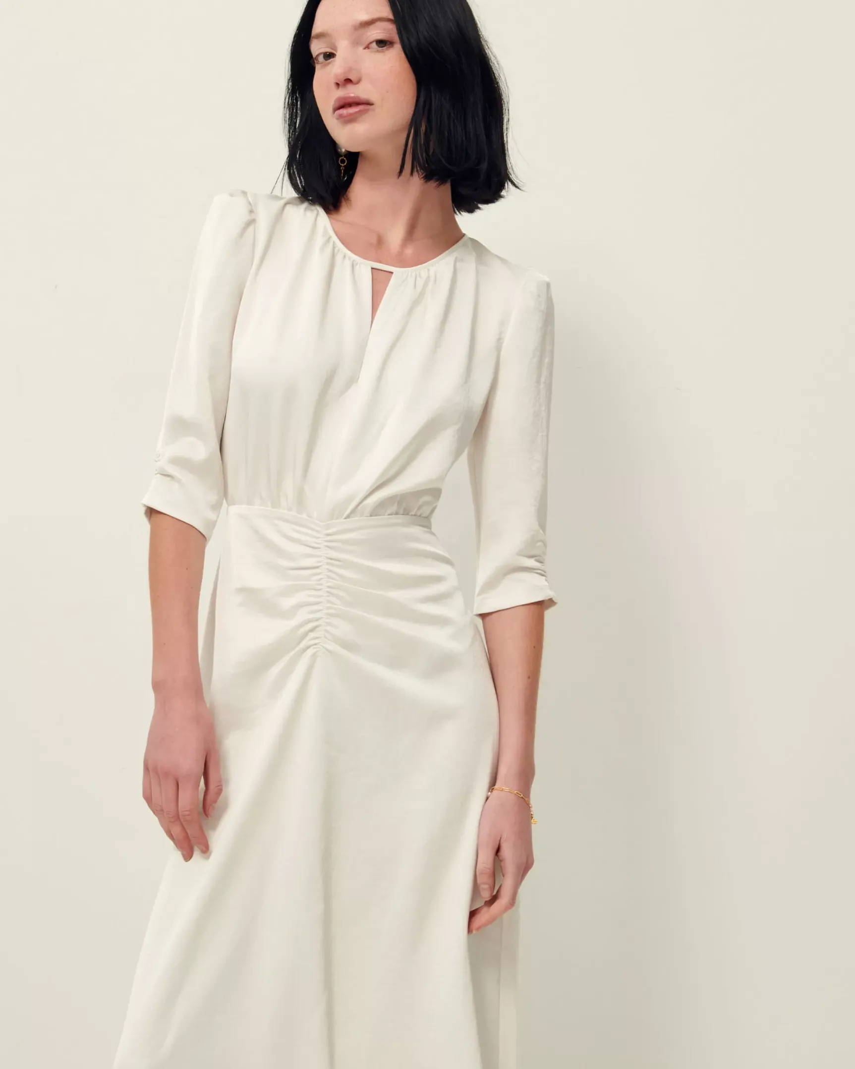 Manches 3/4 avec détails de fronces aux épaules et bas de manches.