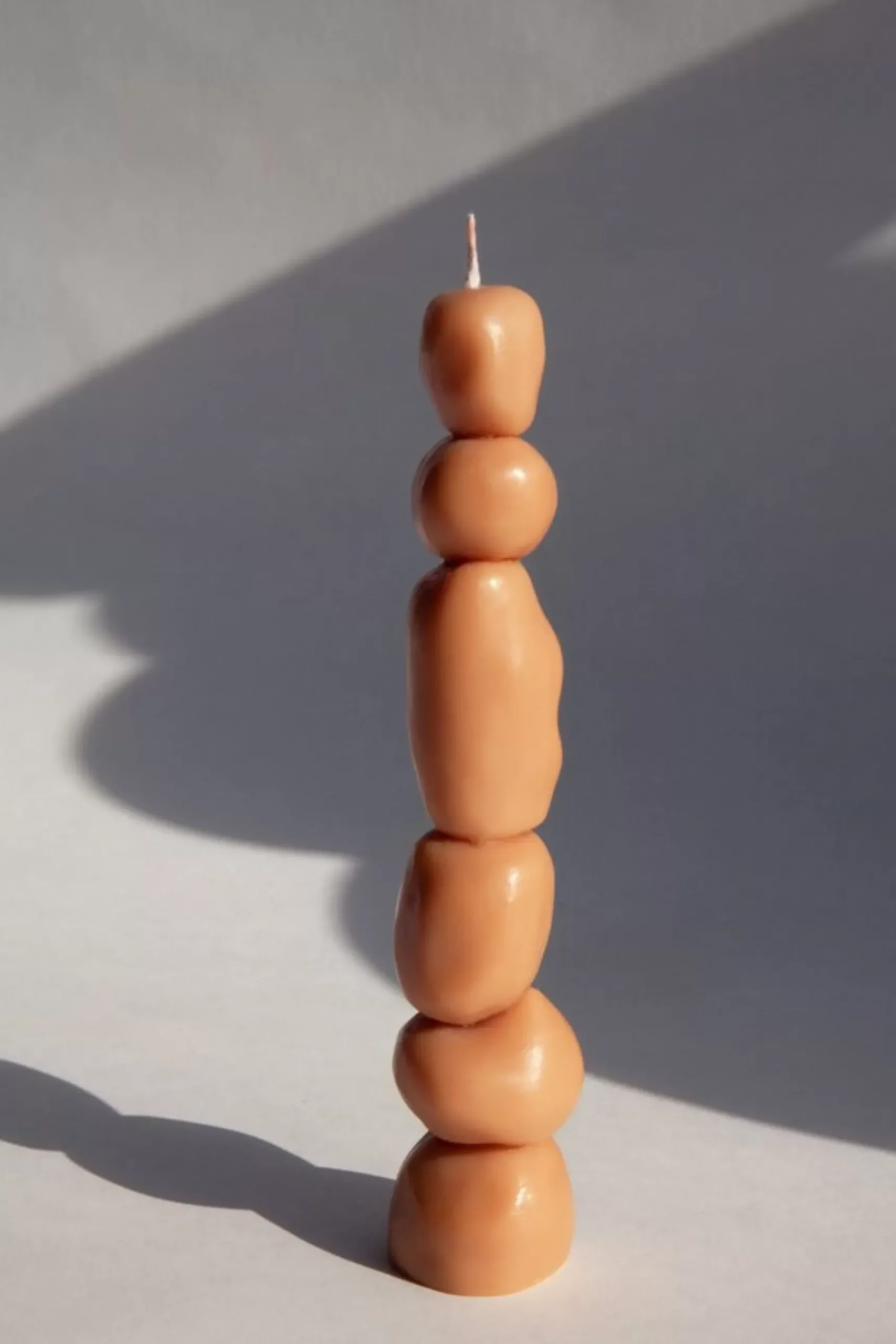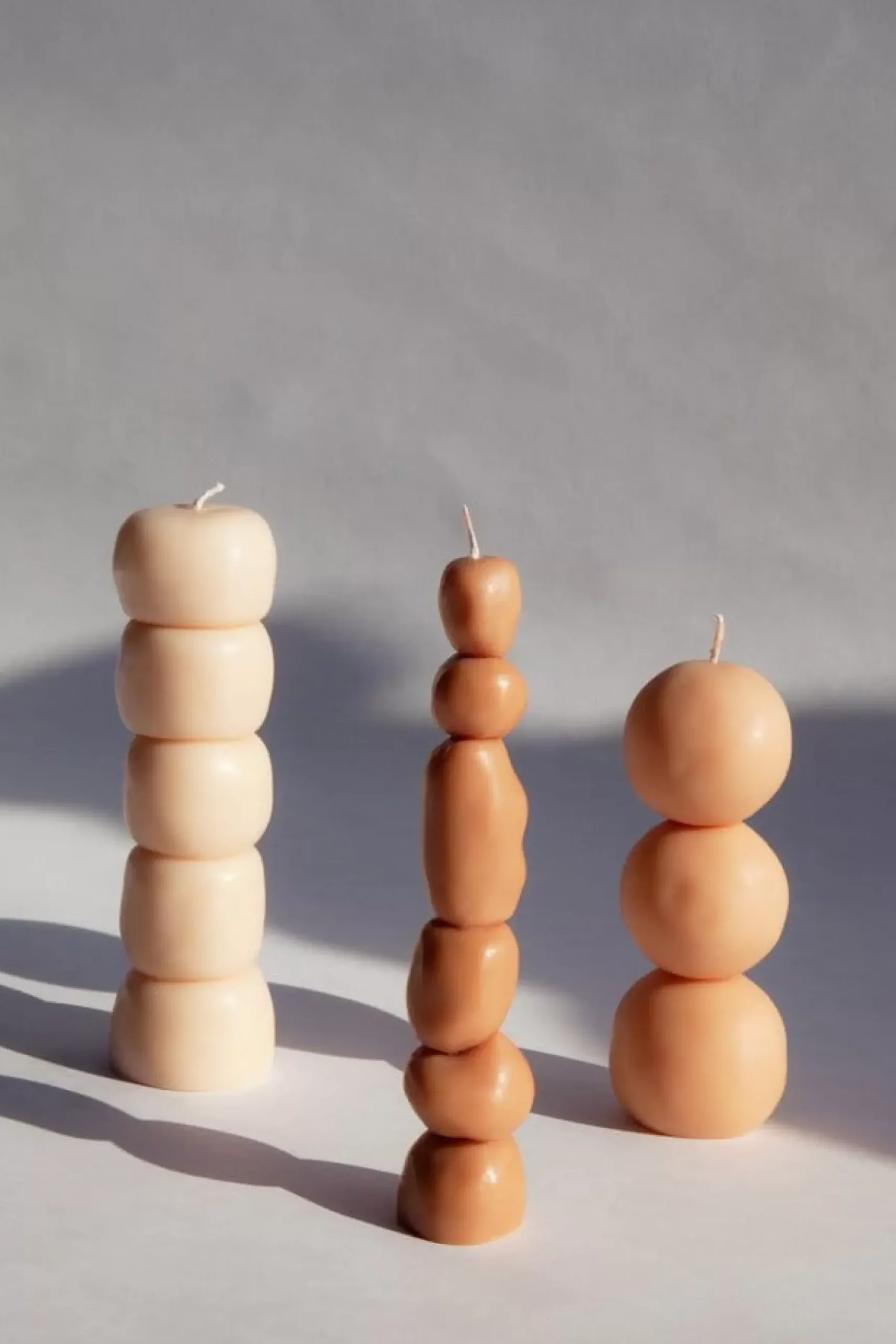 Set de 3 bougies sculpturales aux lignes organiques, façonnées à partir de cire de soja – l’utilisation de paraffine est réduite au strict minimum, nécessaire à la tenue de la bougie.