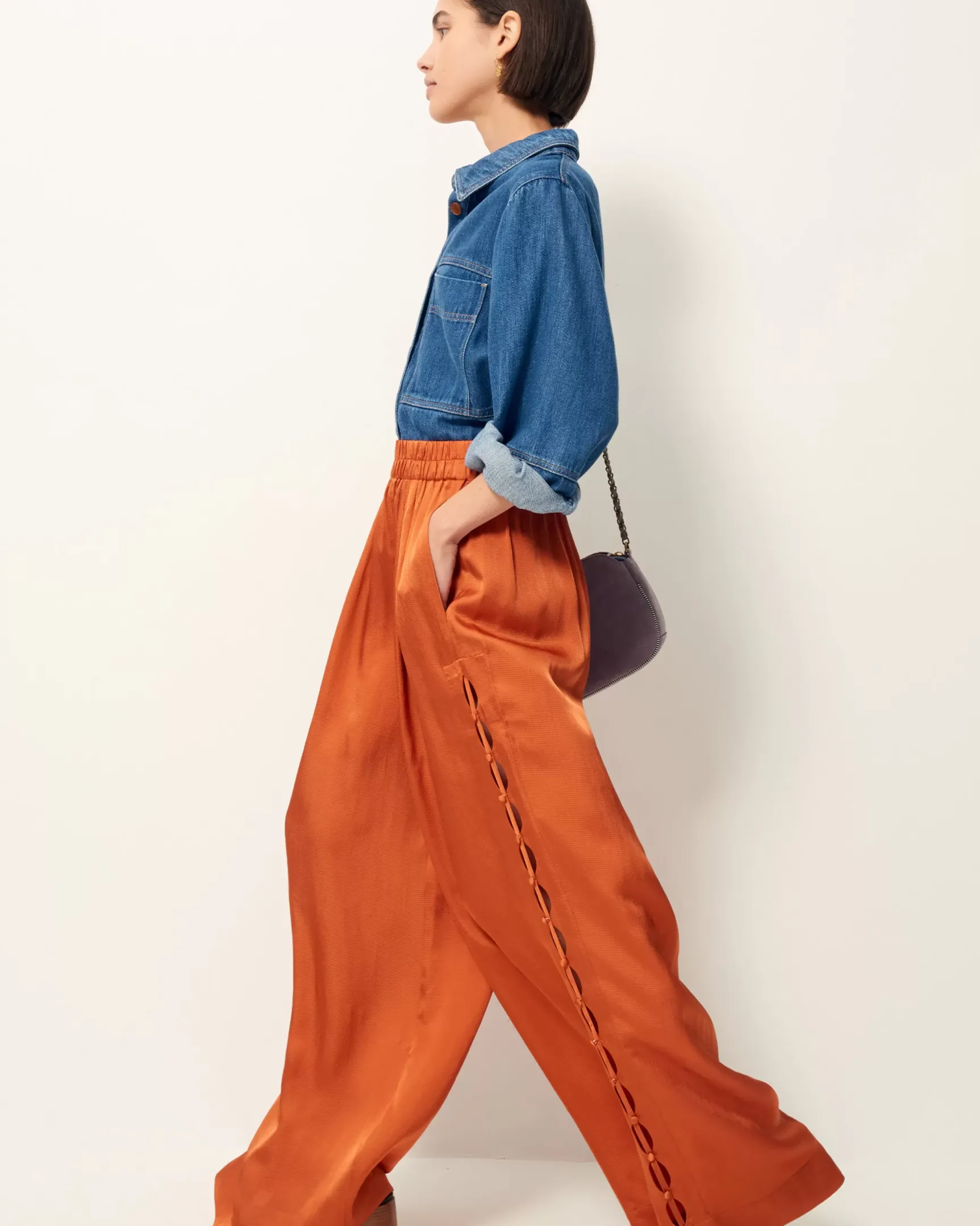 Pantalon ample à la taille élastiquée en satin de viscose seersucker.