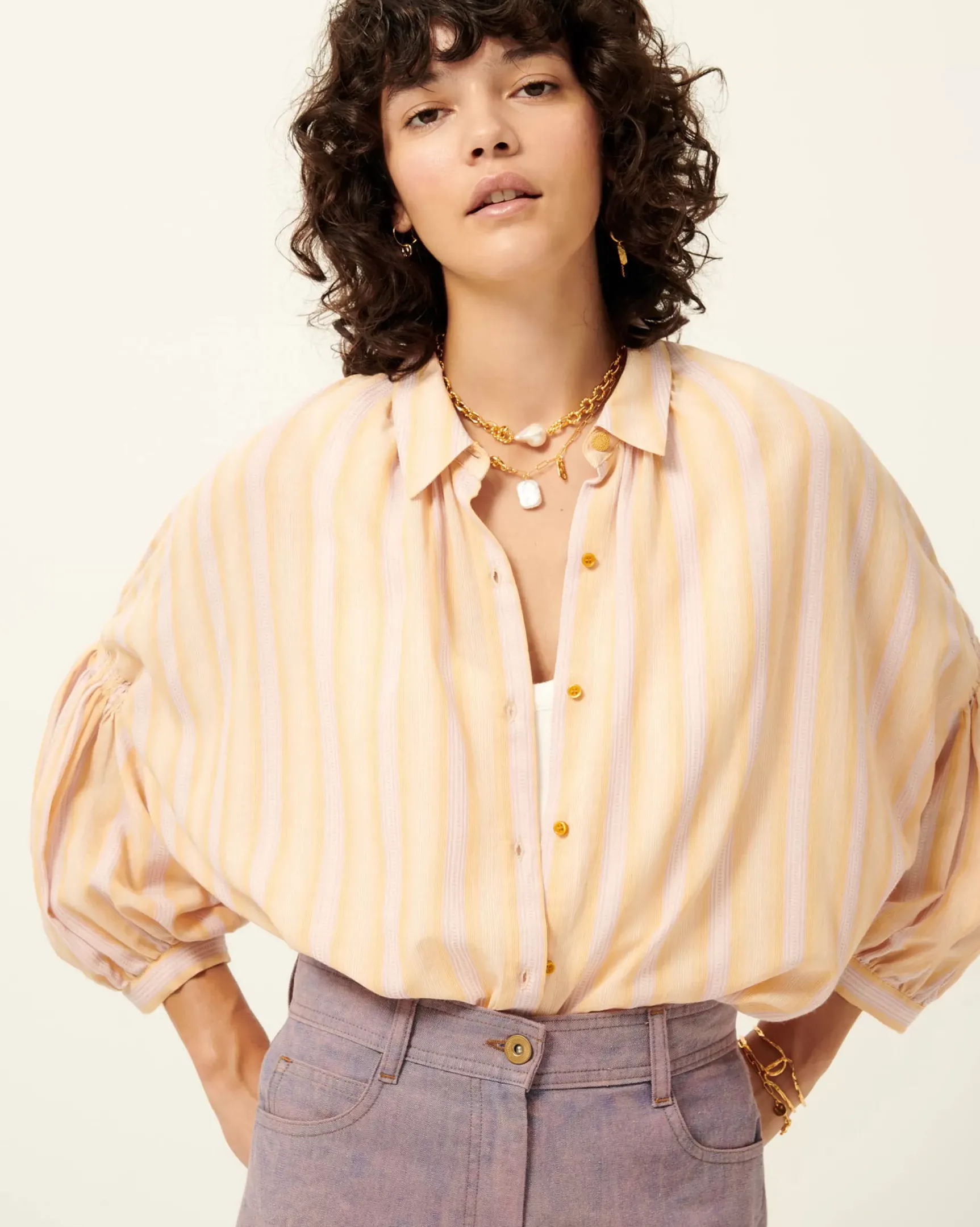 Chemise ample esprit blouse de peintre en linon à rayures avec travail d’armure tissé en Italie, exclusif Sessùn.