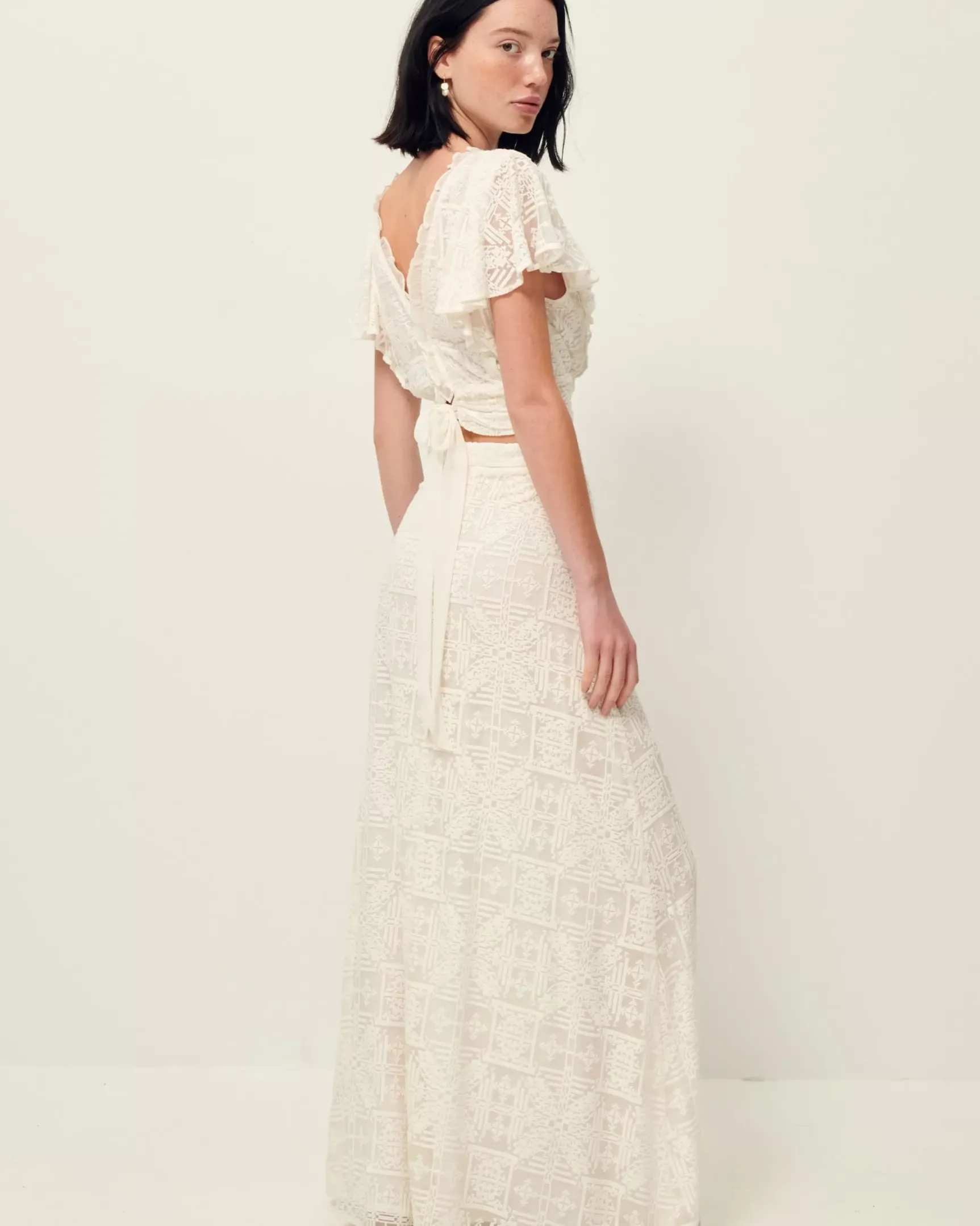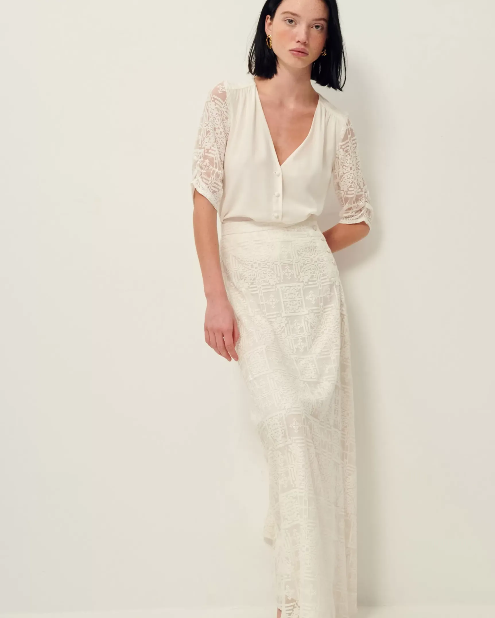 Jupe longue en dentelle points de croix sur mousseline de soie.