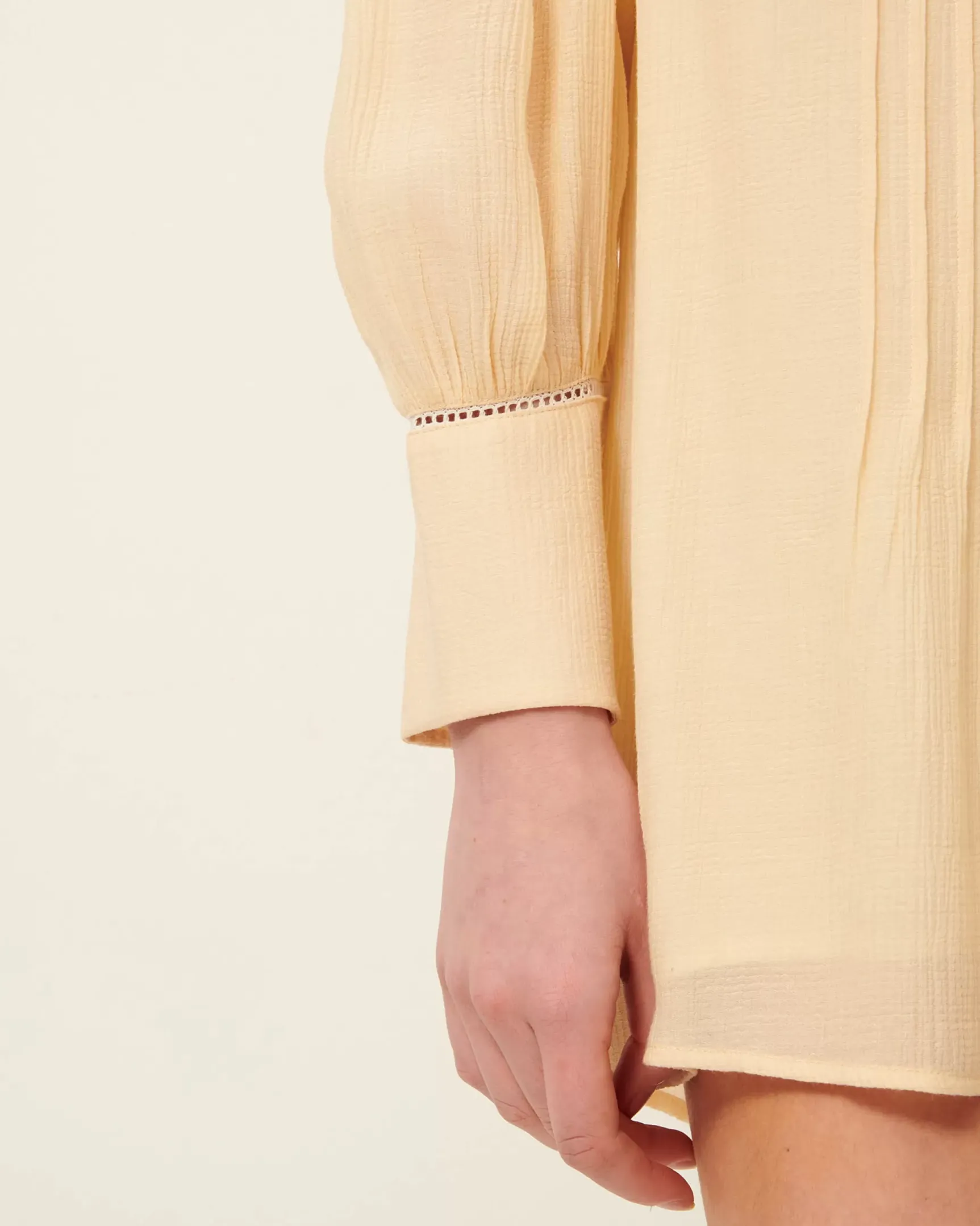 Robe courte en crépon de viscose satiné, détails de plis piqués et de galons ajourés