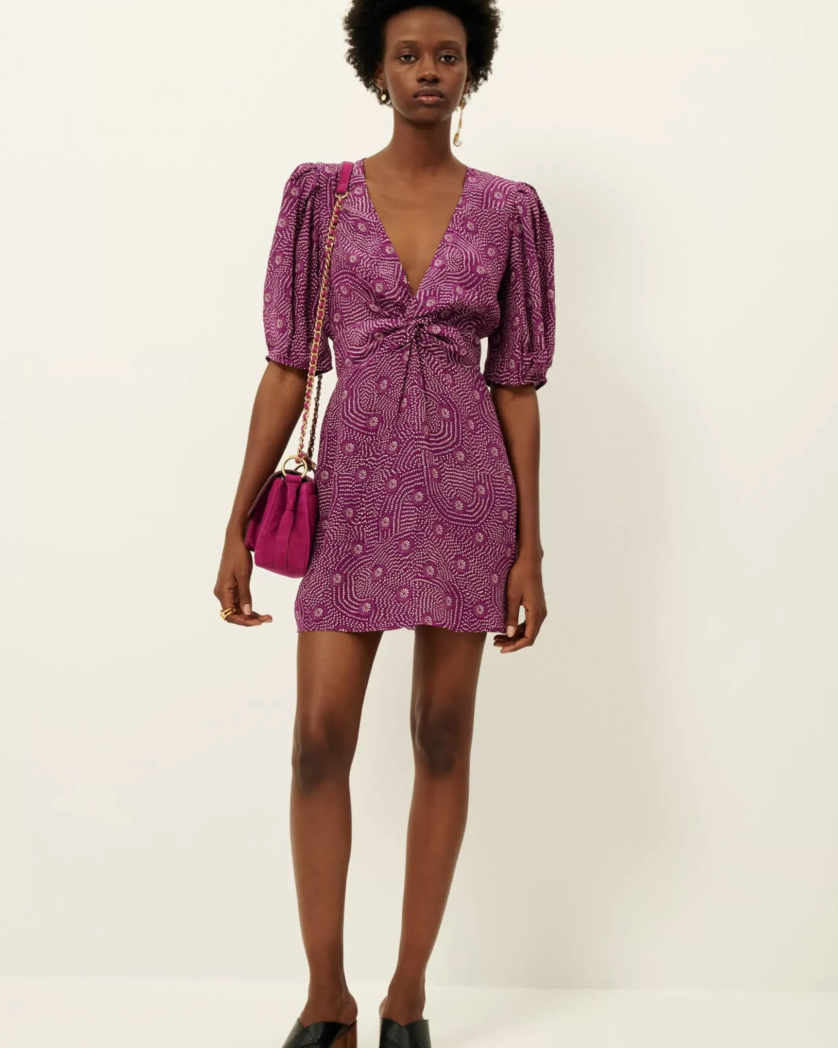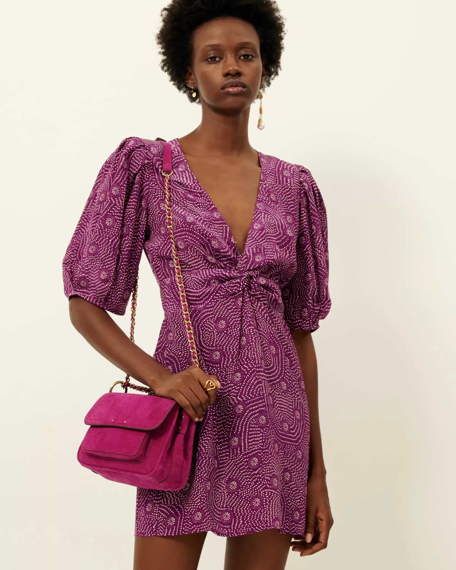 Robe courte à manches ballon nouée devant en toile de viscose fluide et aérienne imprimée, motif exclusif Sessùn.
