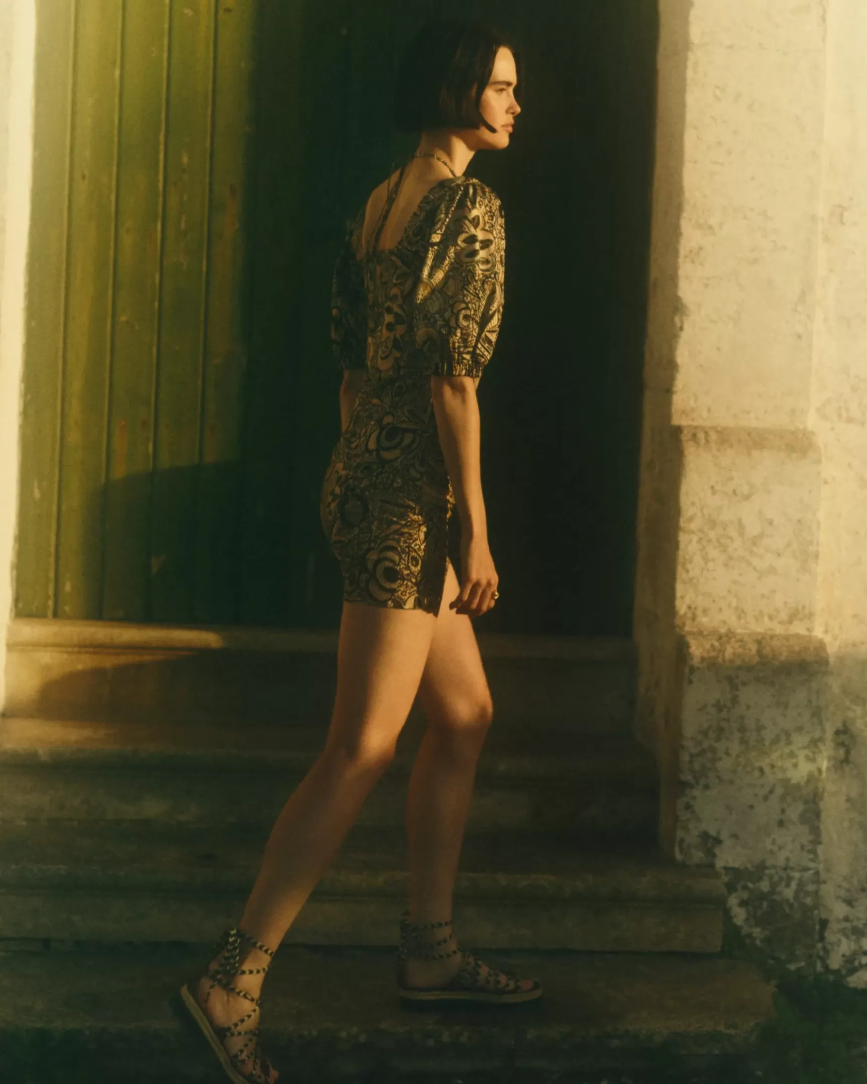 Robe courte ajustée et froncée en popeline de coton stretch imprimée et apprêtée en Italie, motif exclusif Sessùn.