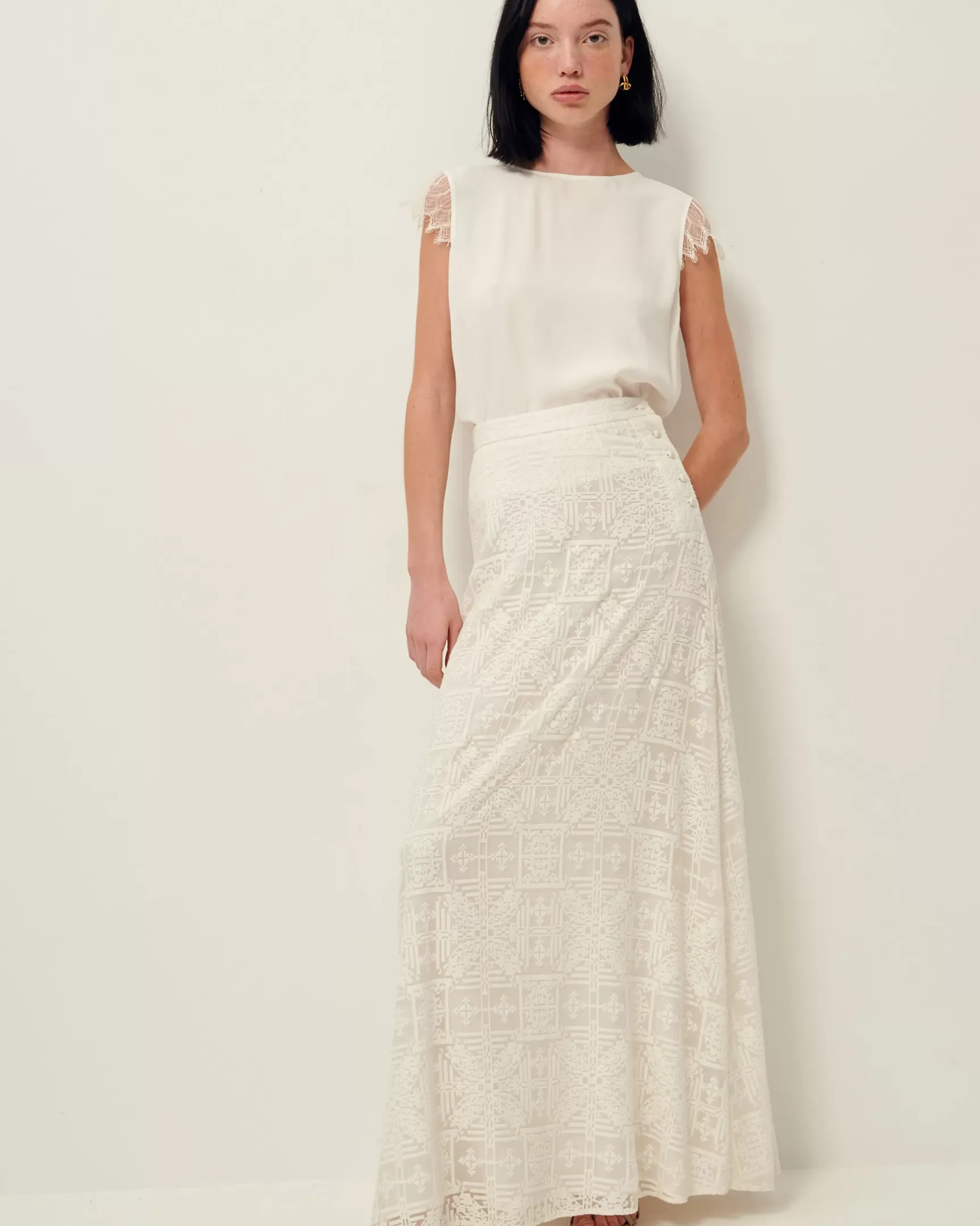 Empiècement dentelle au dos et boutons recouverts dans la matière.