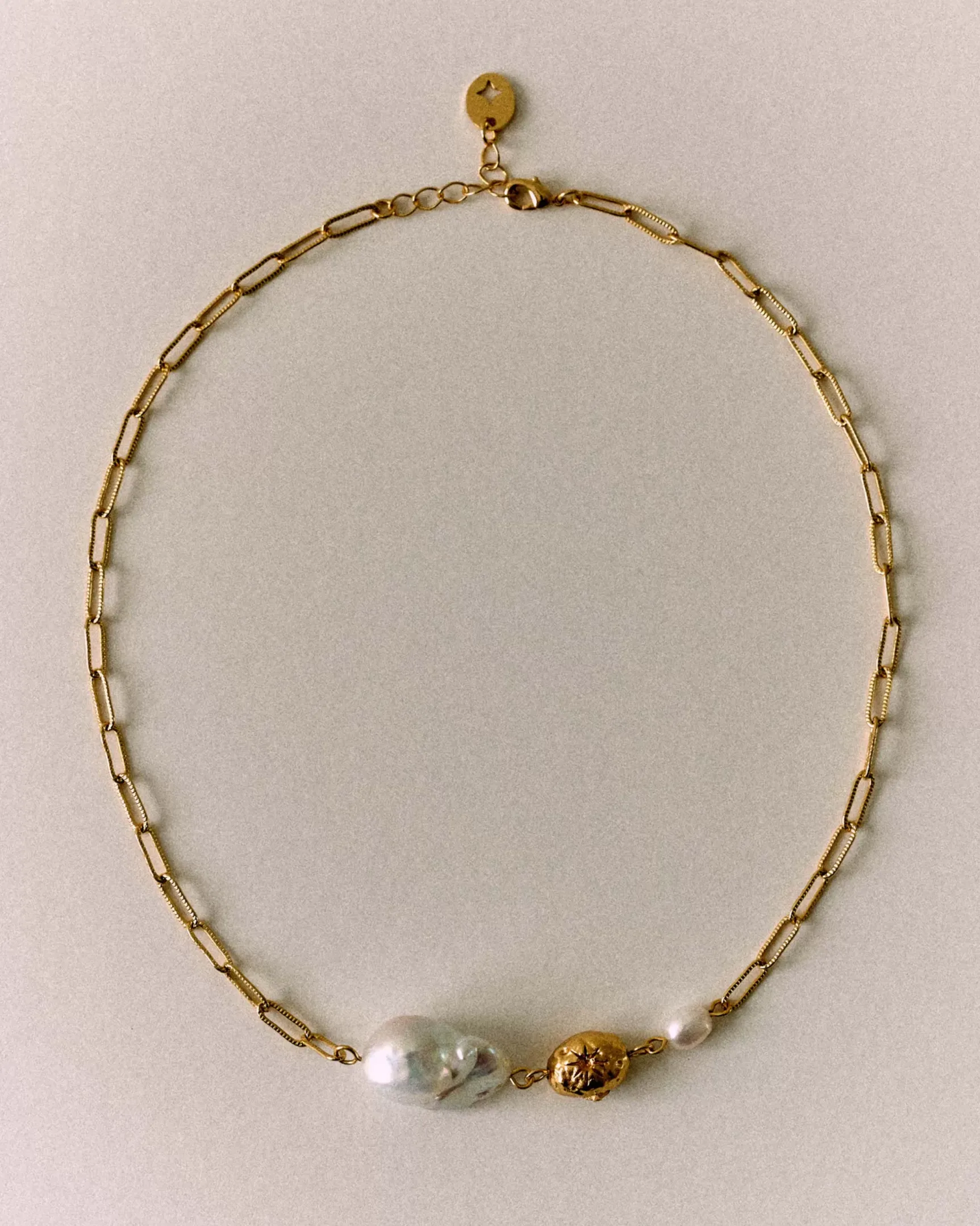 Collier chaine maillon fantaisie, perle d’eau douce nacrée et perle dorée étoilée.