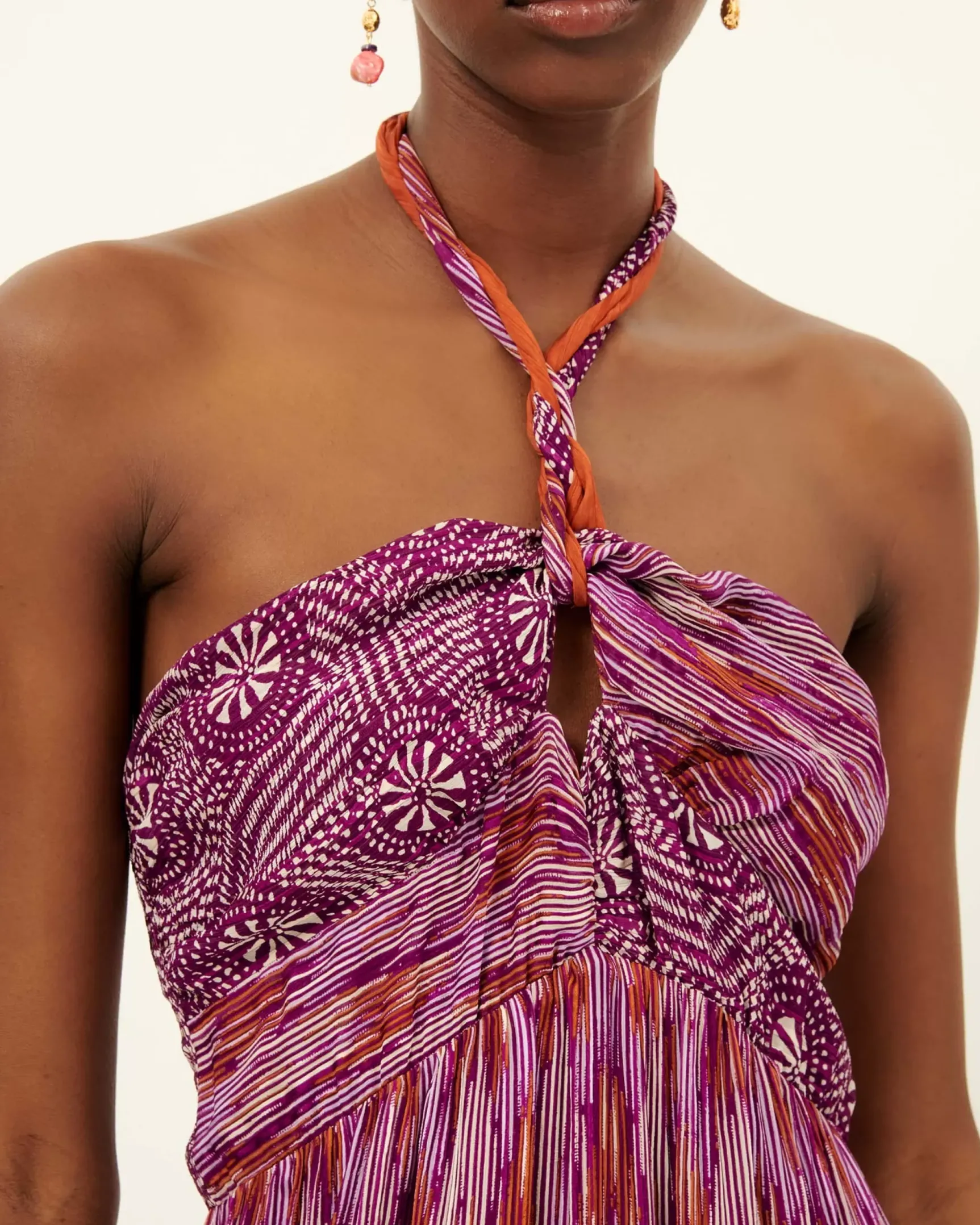 Robe longue à bretelles torsadées en mousseline à rayures jacquard de viscose imprimée, mix de motifs exclusifs Sessùn.