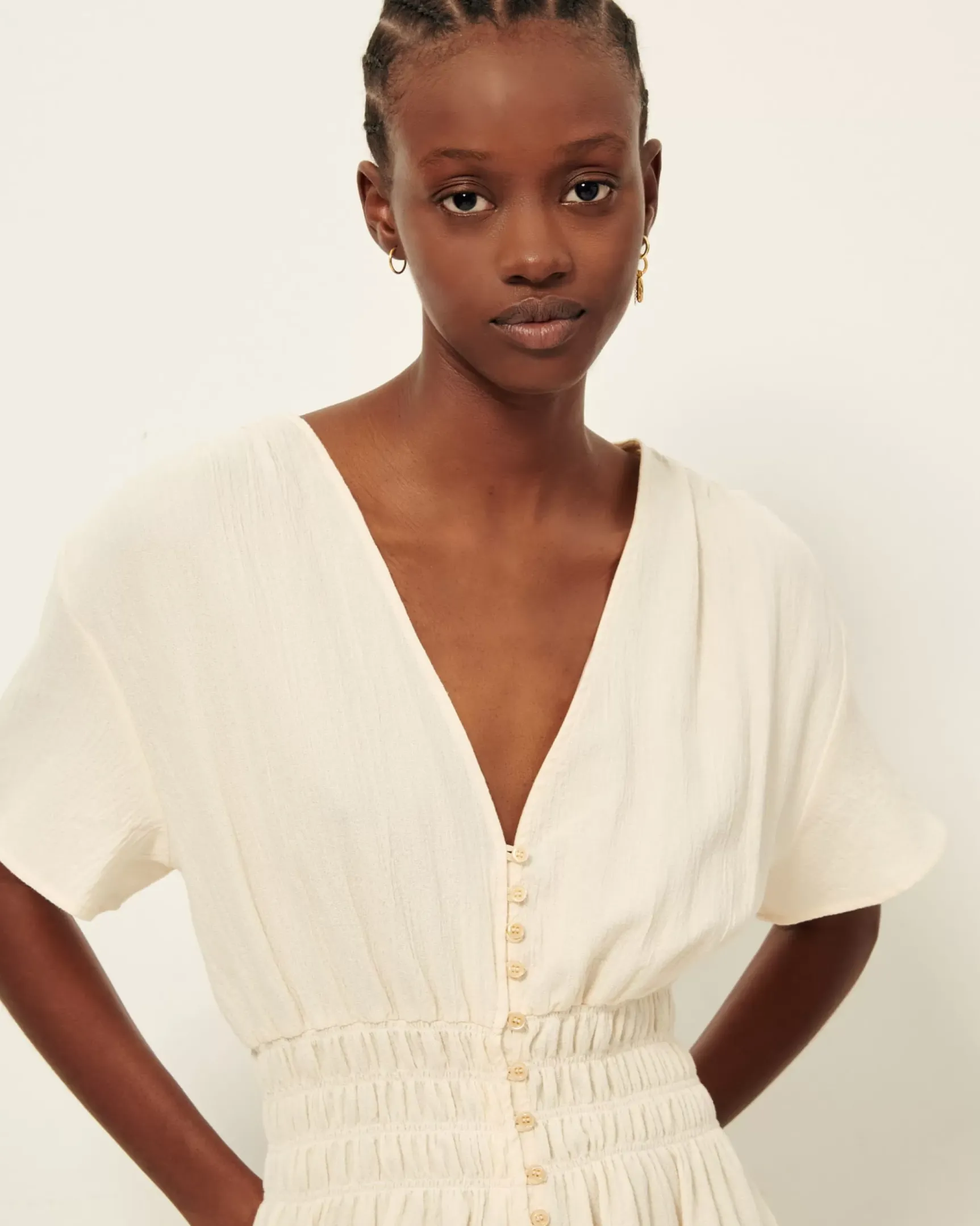 Robe mi-longue smockée à la taille en crépon de coton.