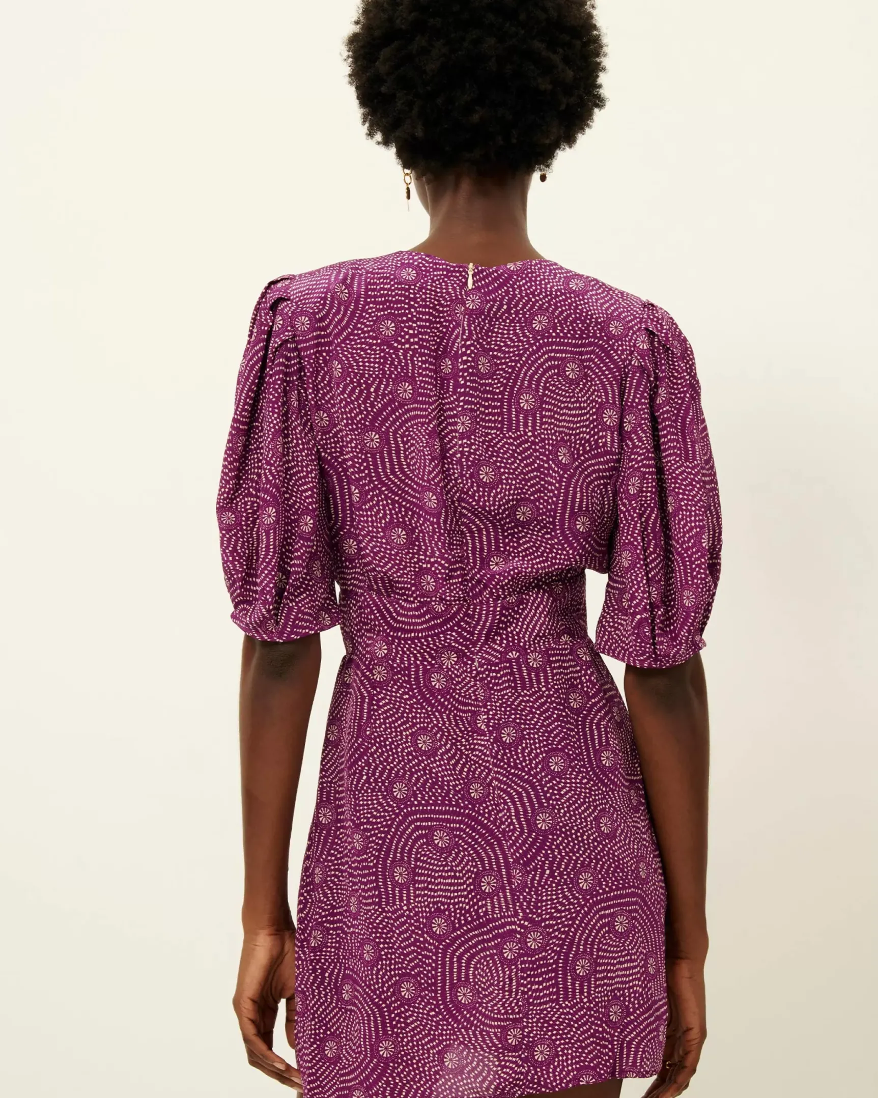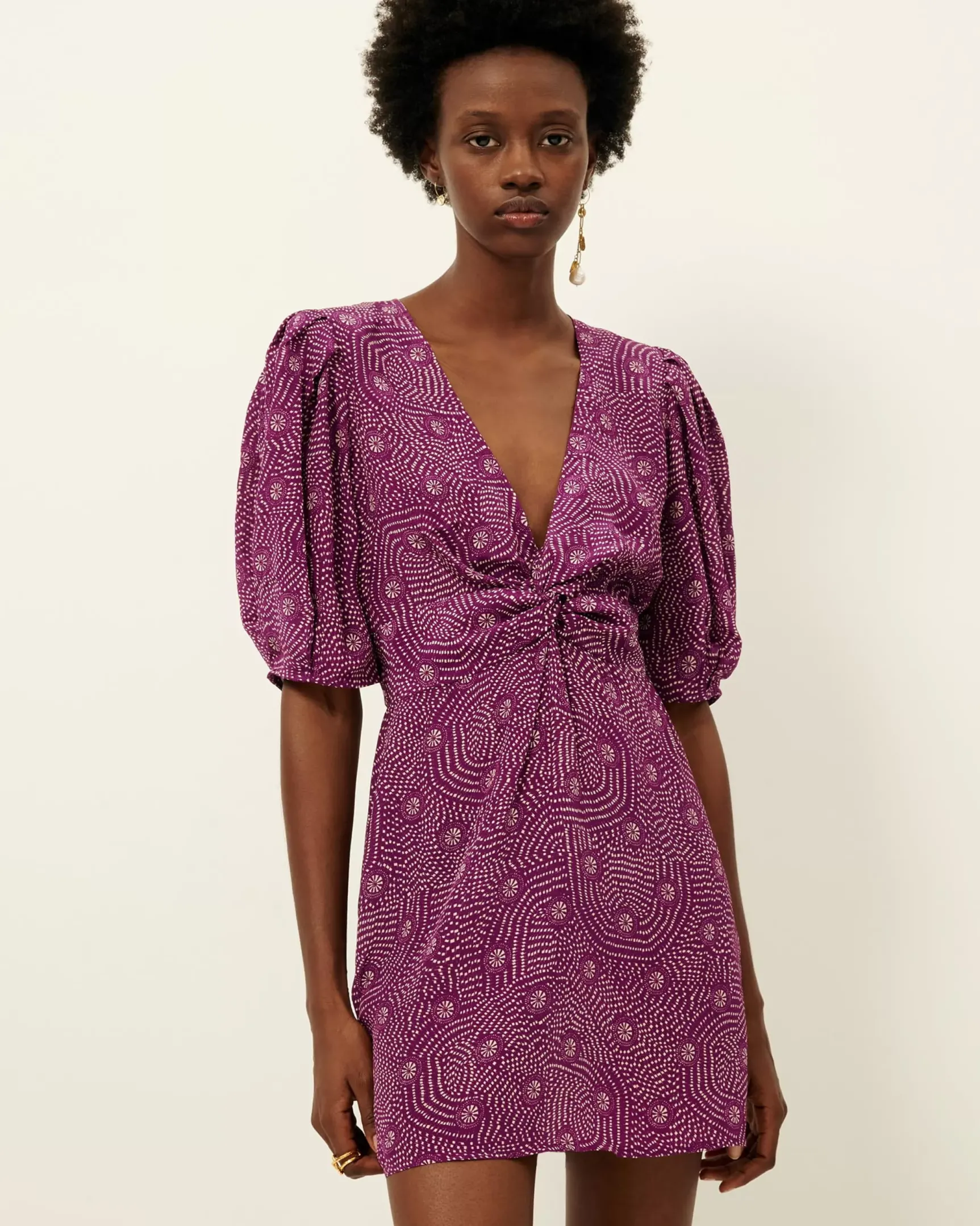 Robe courte à manches ballon nouée devant en toile de viscose fluide et aérienne imprimée, motif exclusif Sessùn.