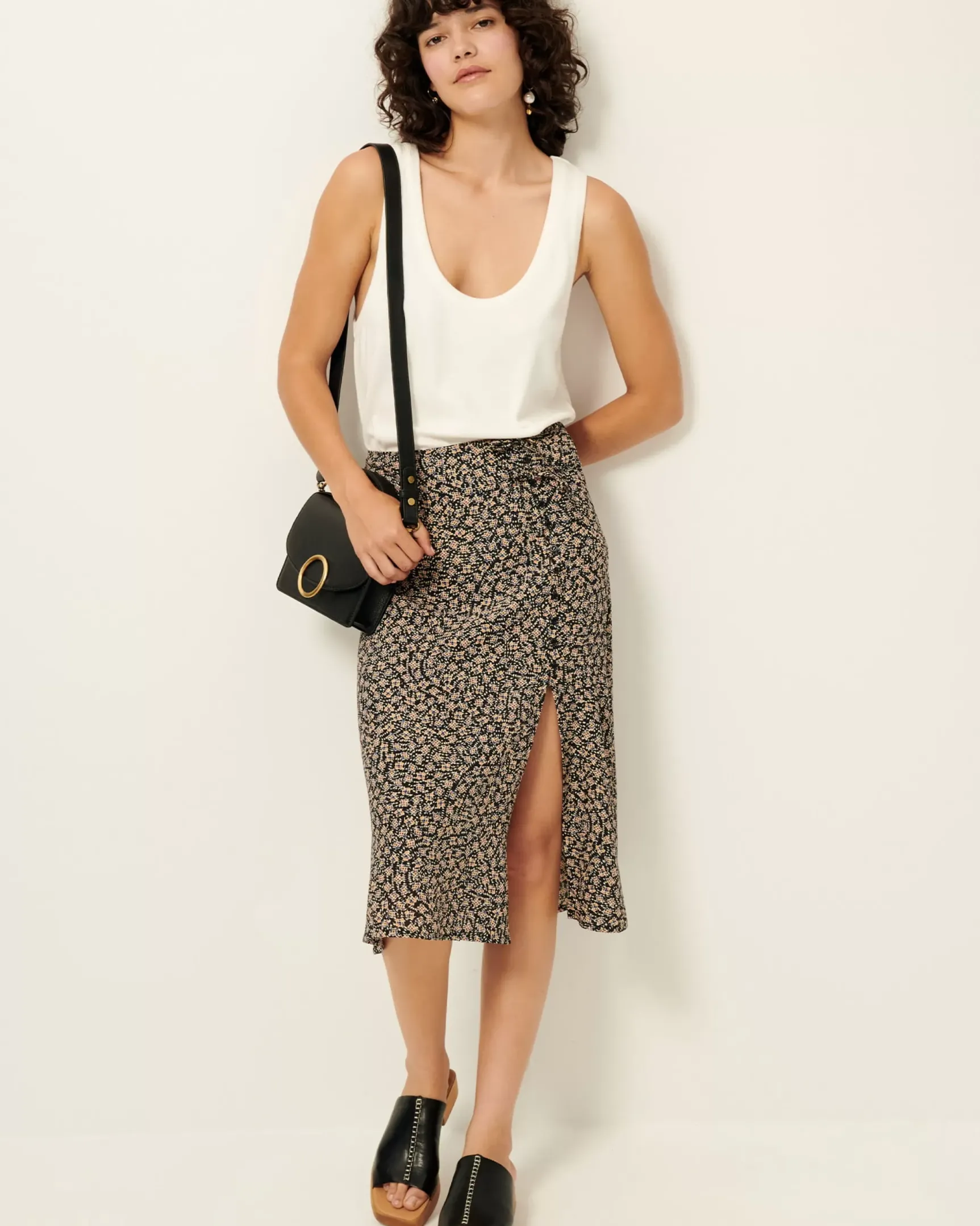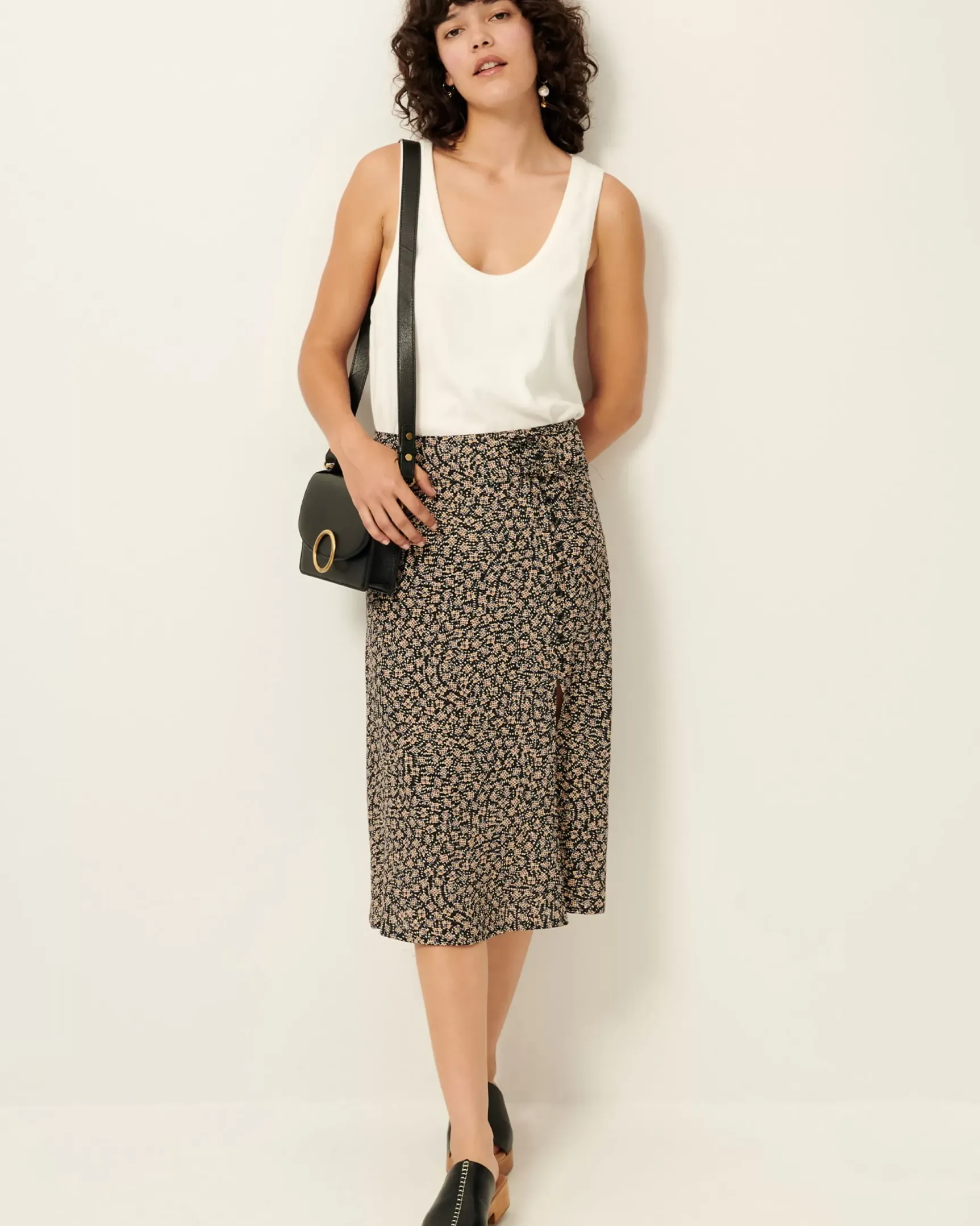 Jupe mi longue boutonnée sur le côté en crépon de viscose imprimé tissé en Italie, motif exclusif Sessùn.