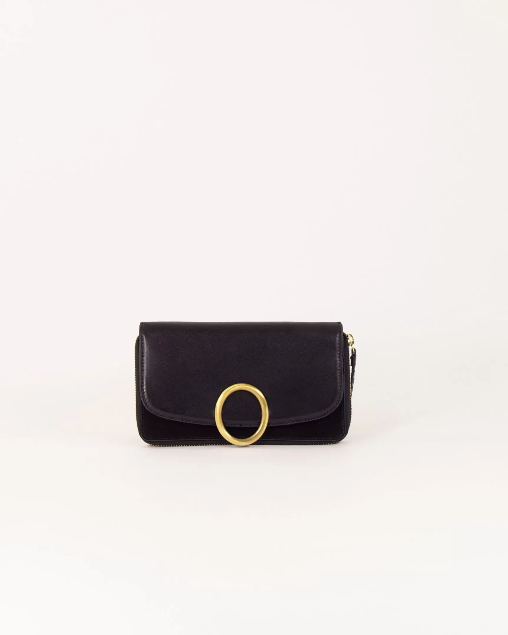 Porte-feuille en cuir avec boucle décorative sur rabat.