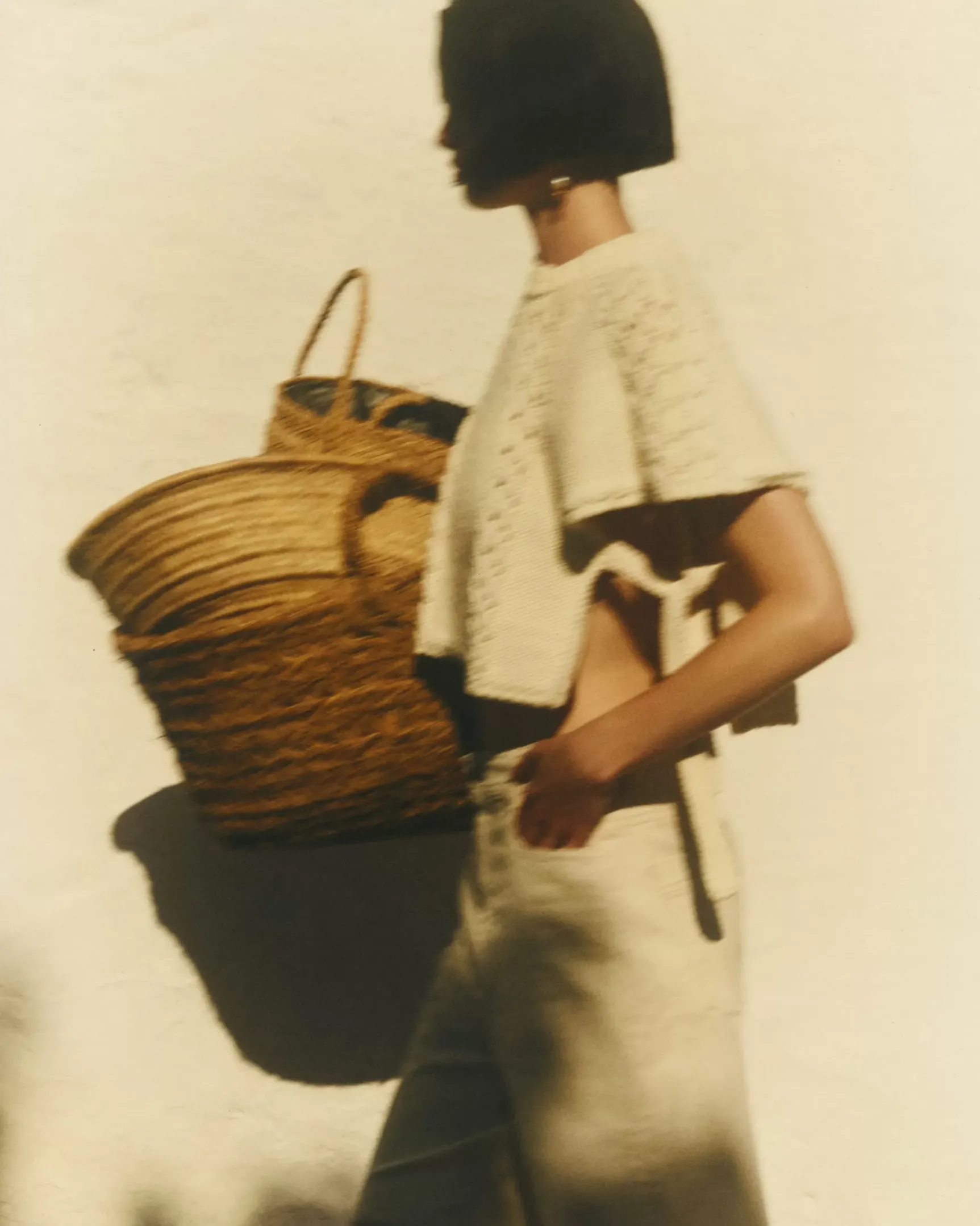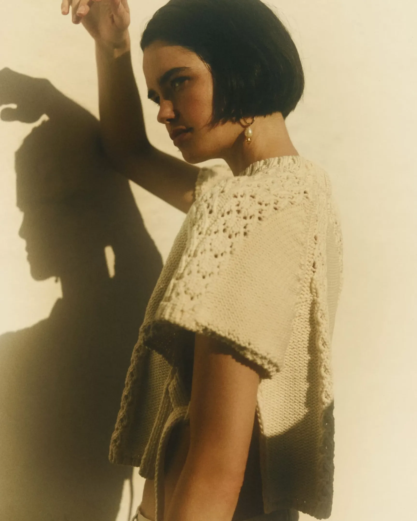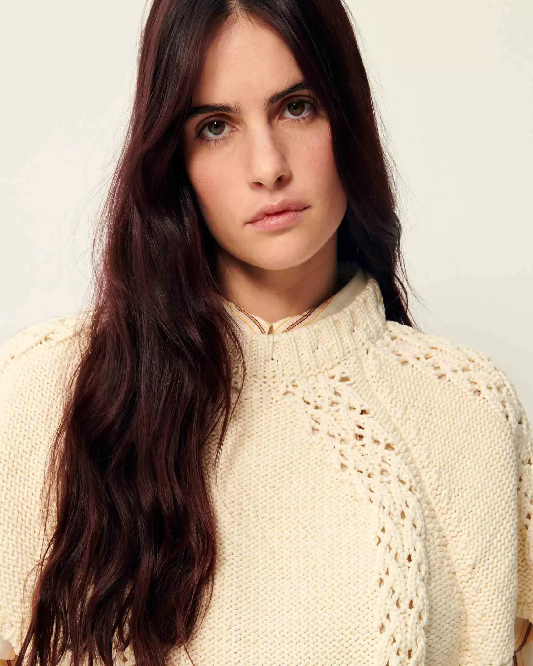 Pull court manches raglan en maille grosse jauge et points ajourés.