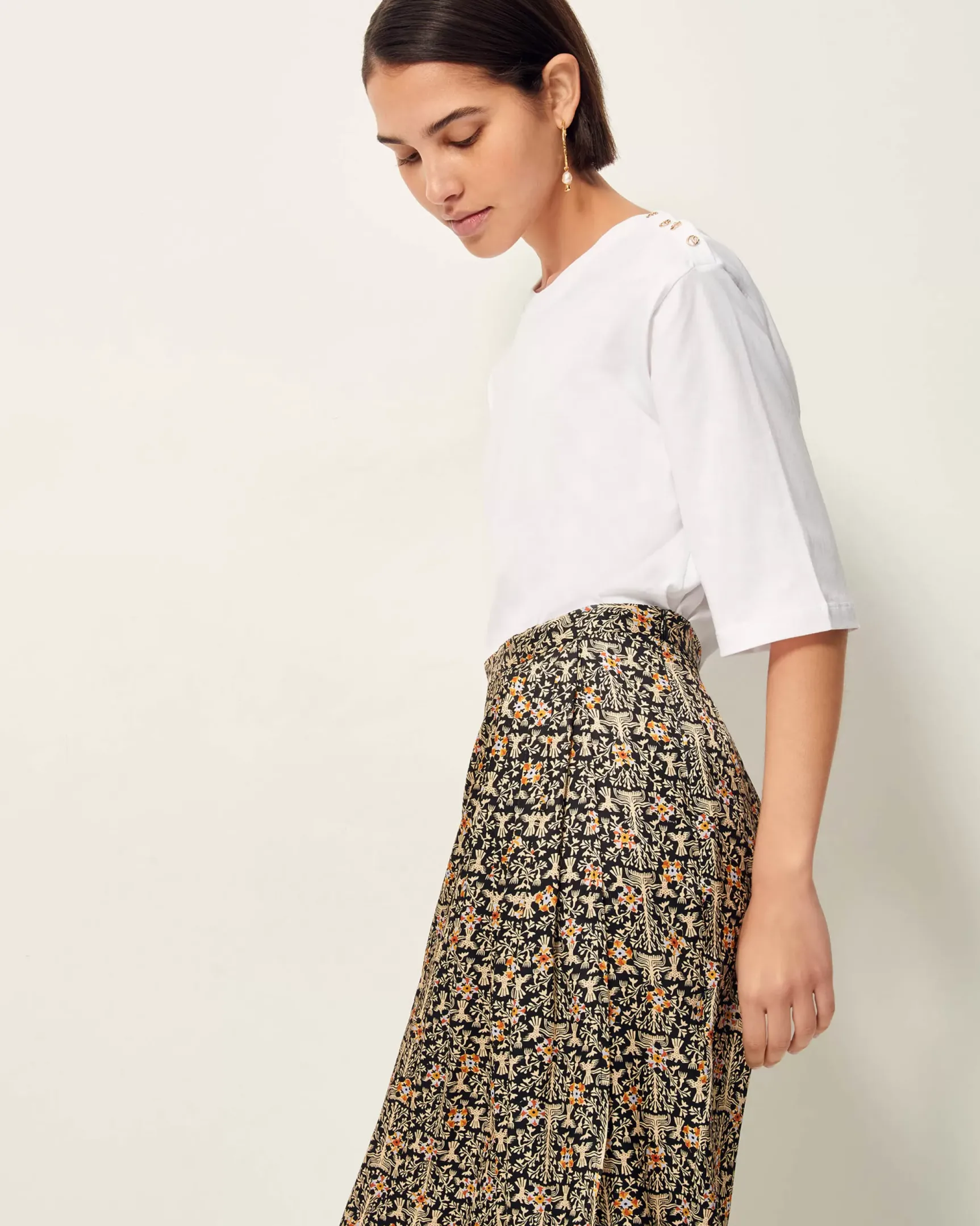 Jupe portefeuille à plis couchés à la taille, mi-longue, en satin fluide imprimé et apprêté en Italie, motif exclusif Sessùn.