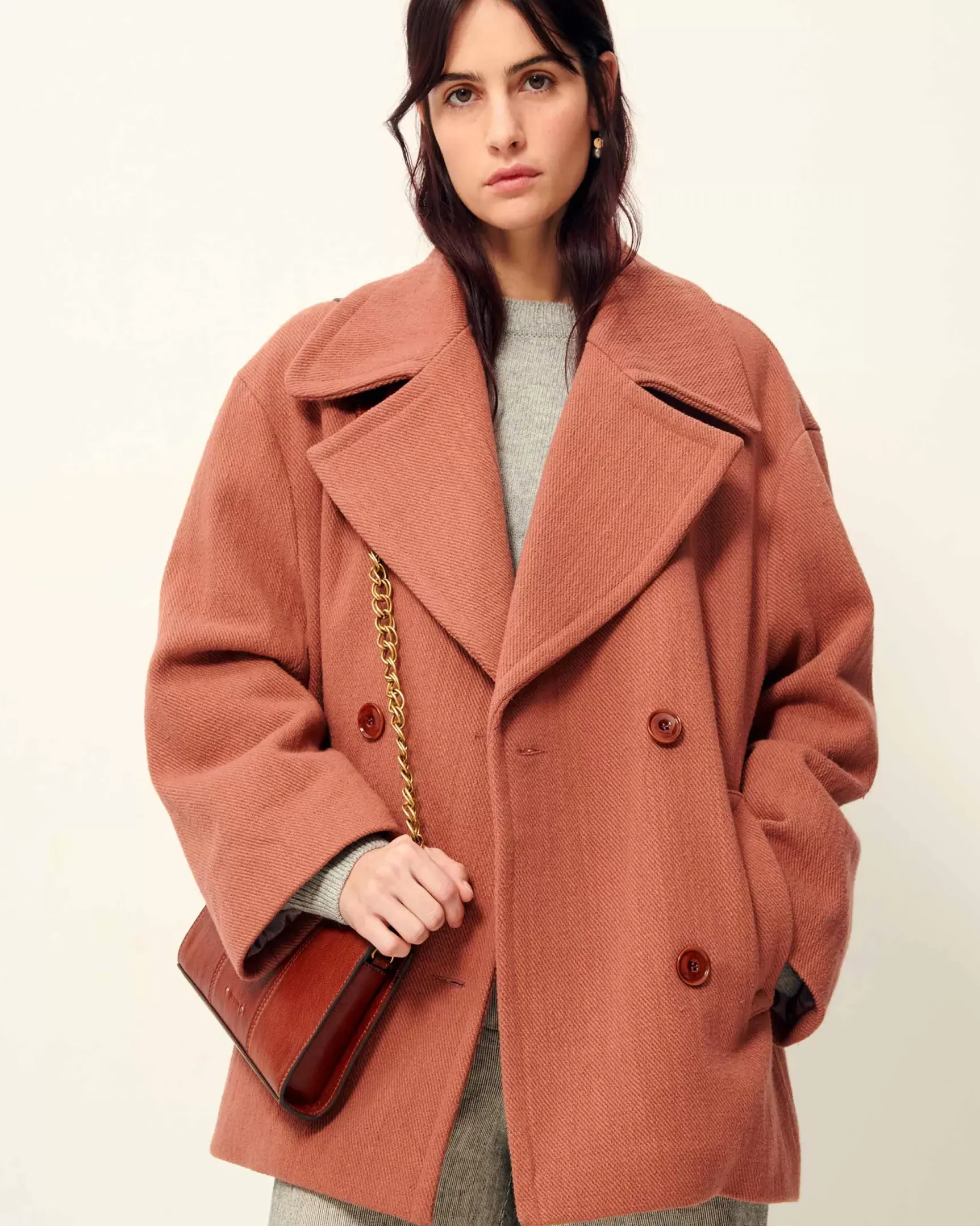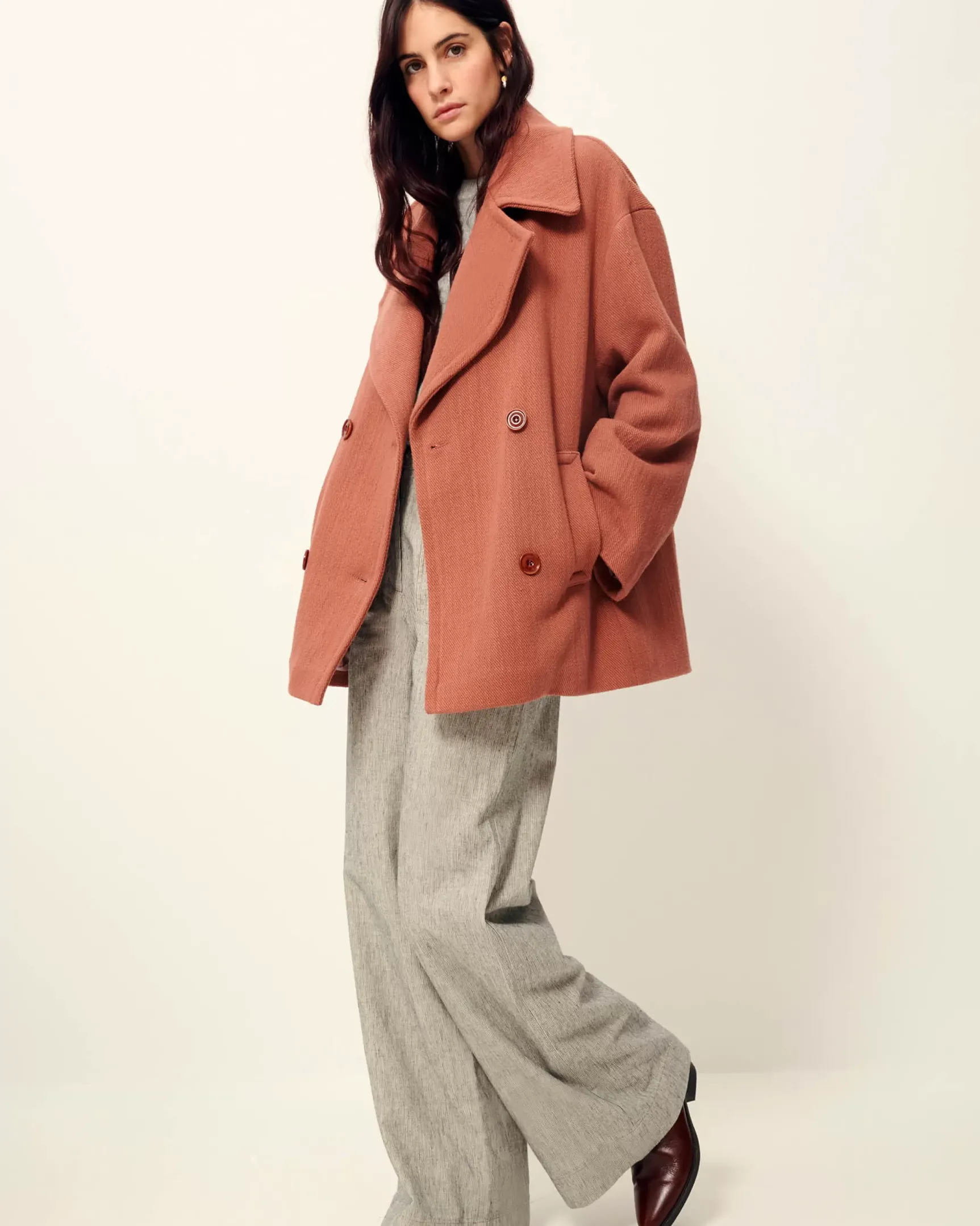 Caban oversize à double boutonnage en tricotine de coton de fils bourrette recyclés tissé en Italie.