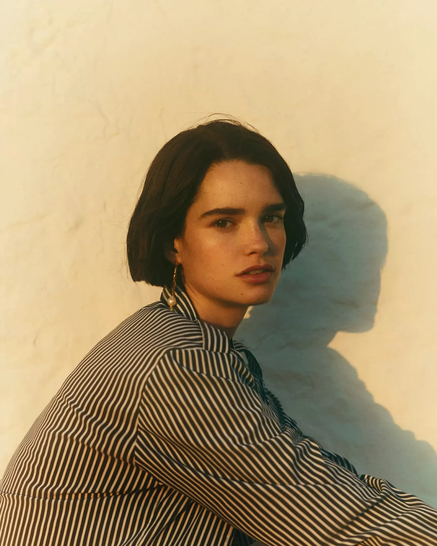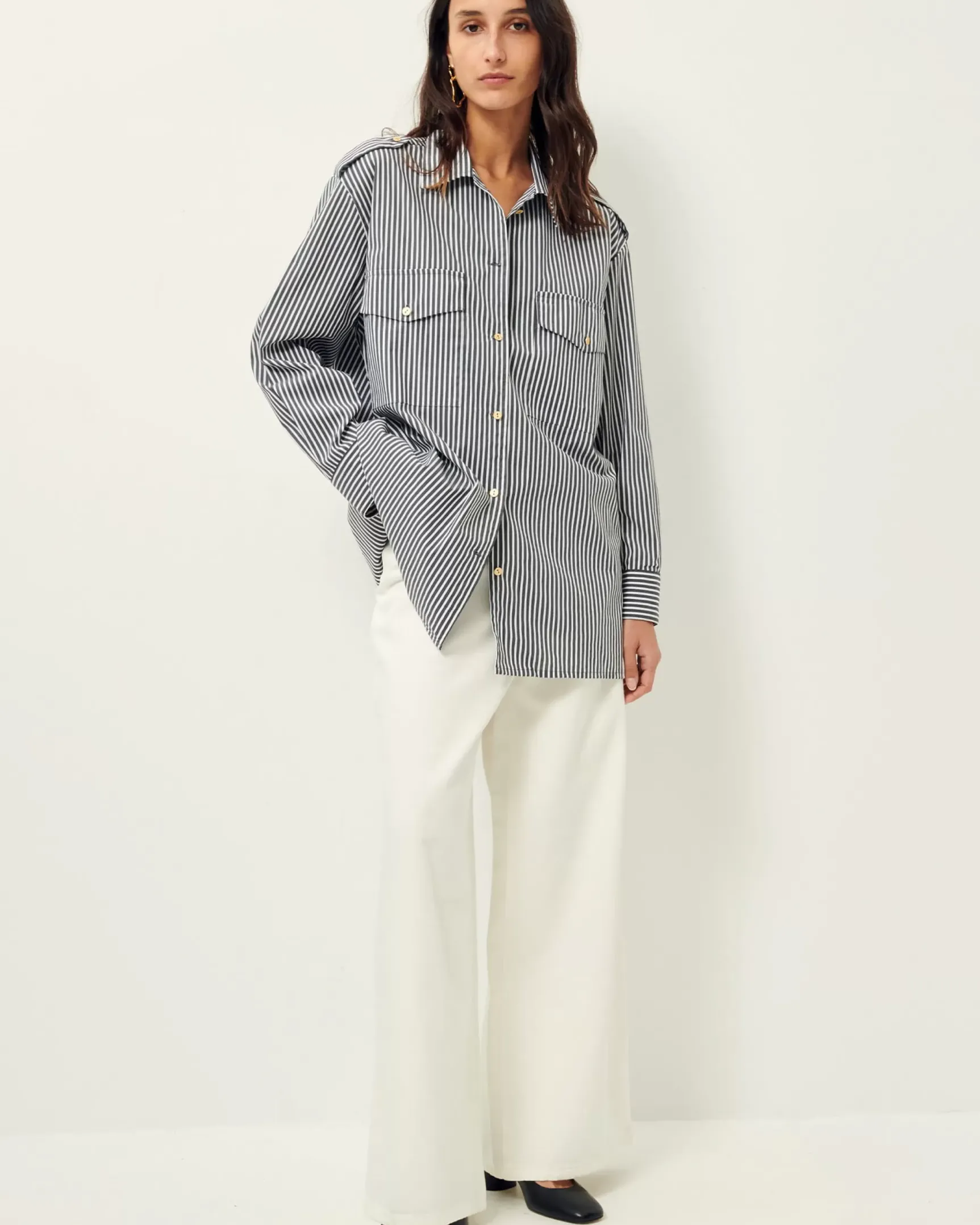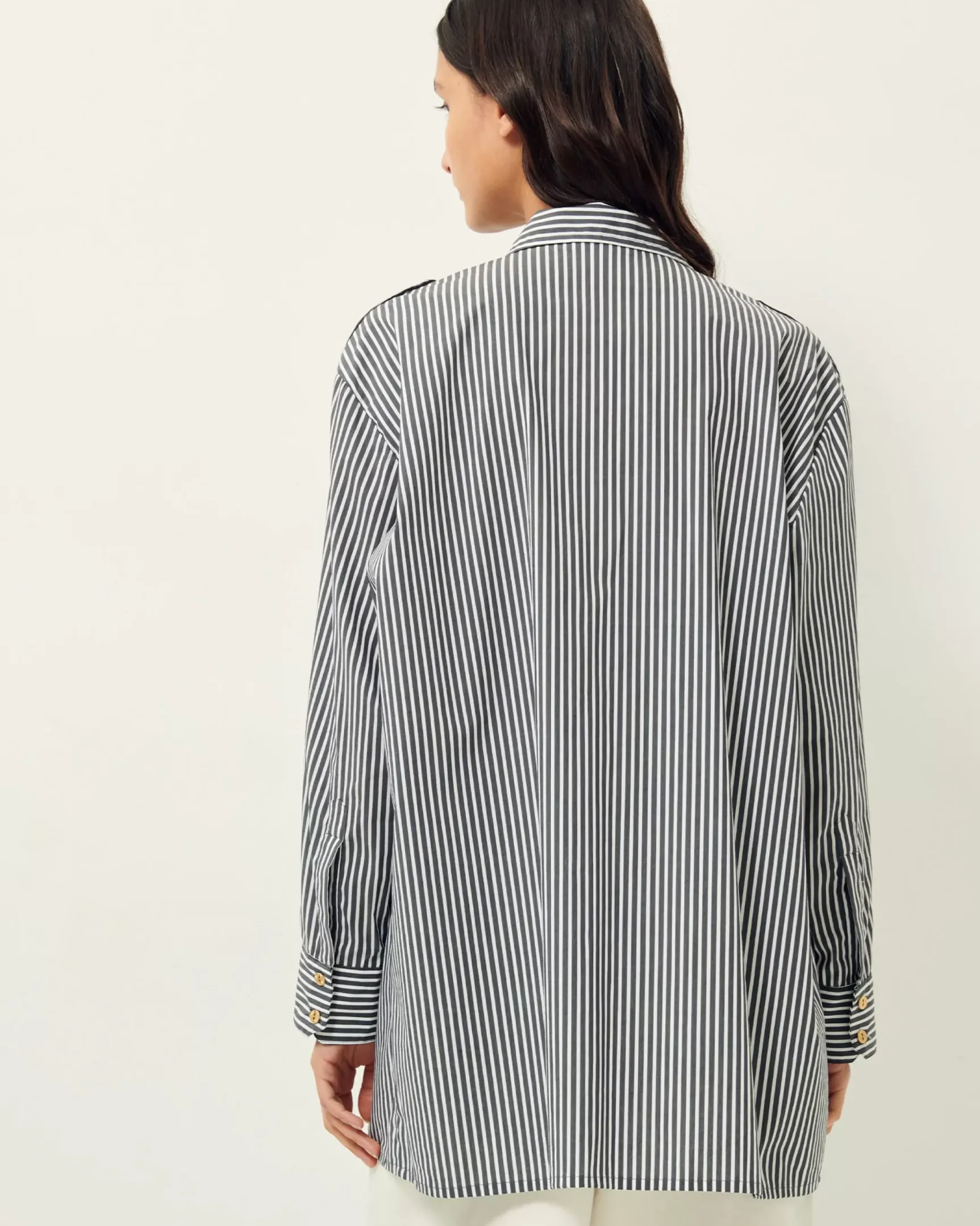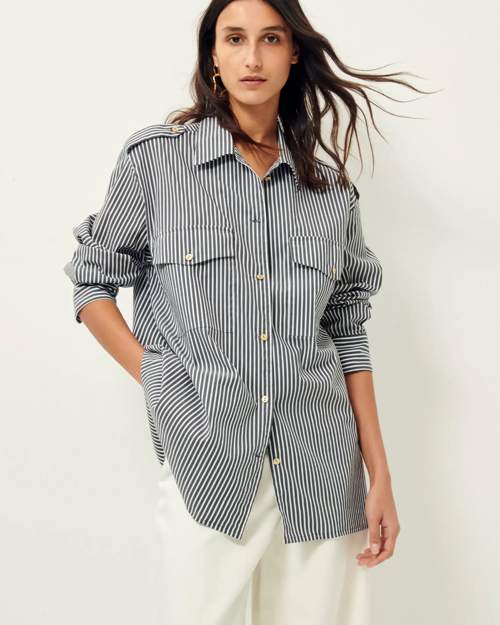 Chemise rallongée esprit officier à pattes épaules et poches plaquées en popeline compacte à rayures bayadère, tissé en Italie.