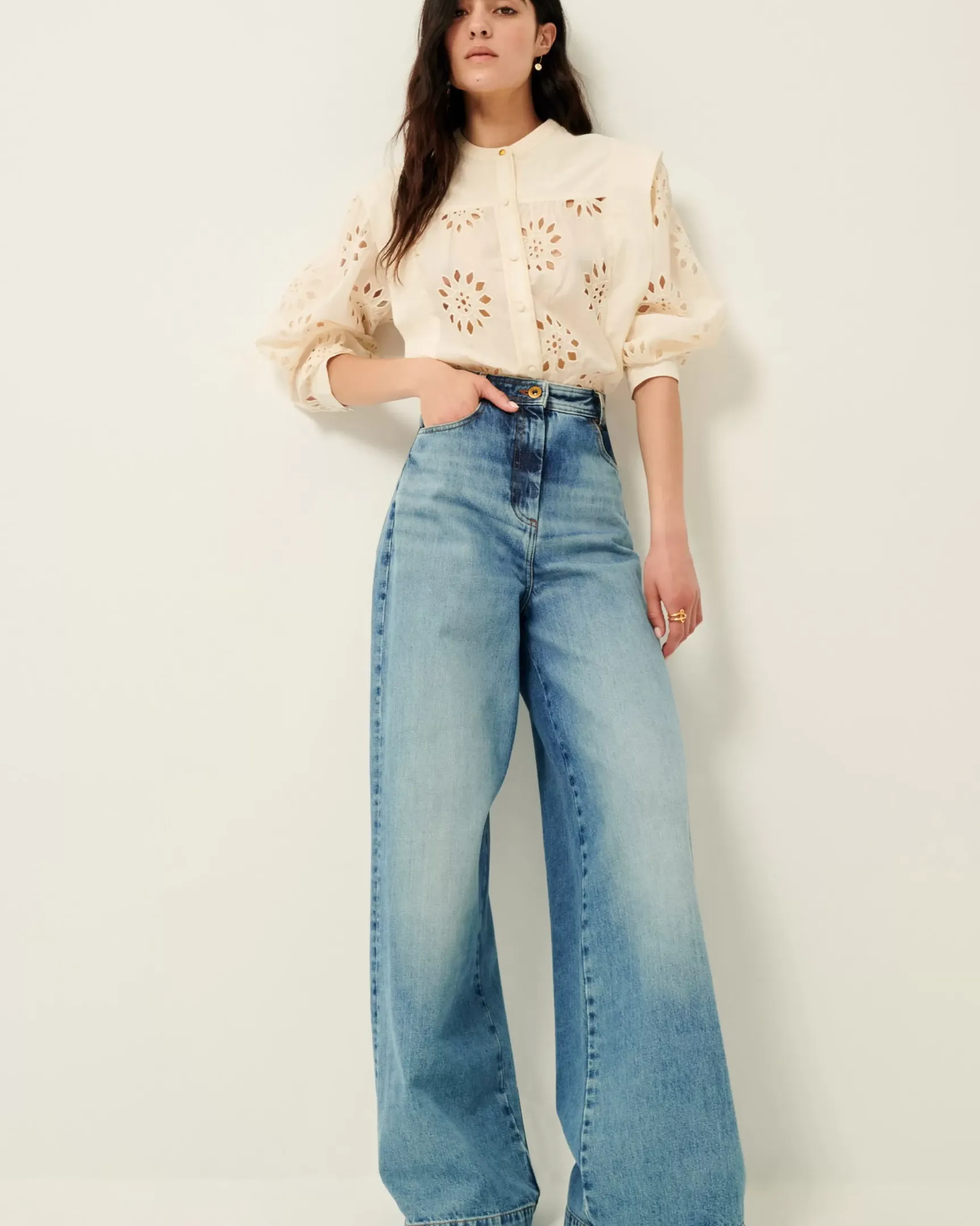 Blouse avec plis à l’épaule en voile de coton brodé ajouré esprit broderie anglaise, et frises point chainette en détail, motif exclusif Sessùn.