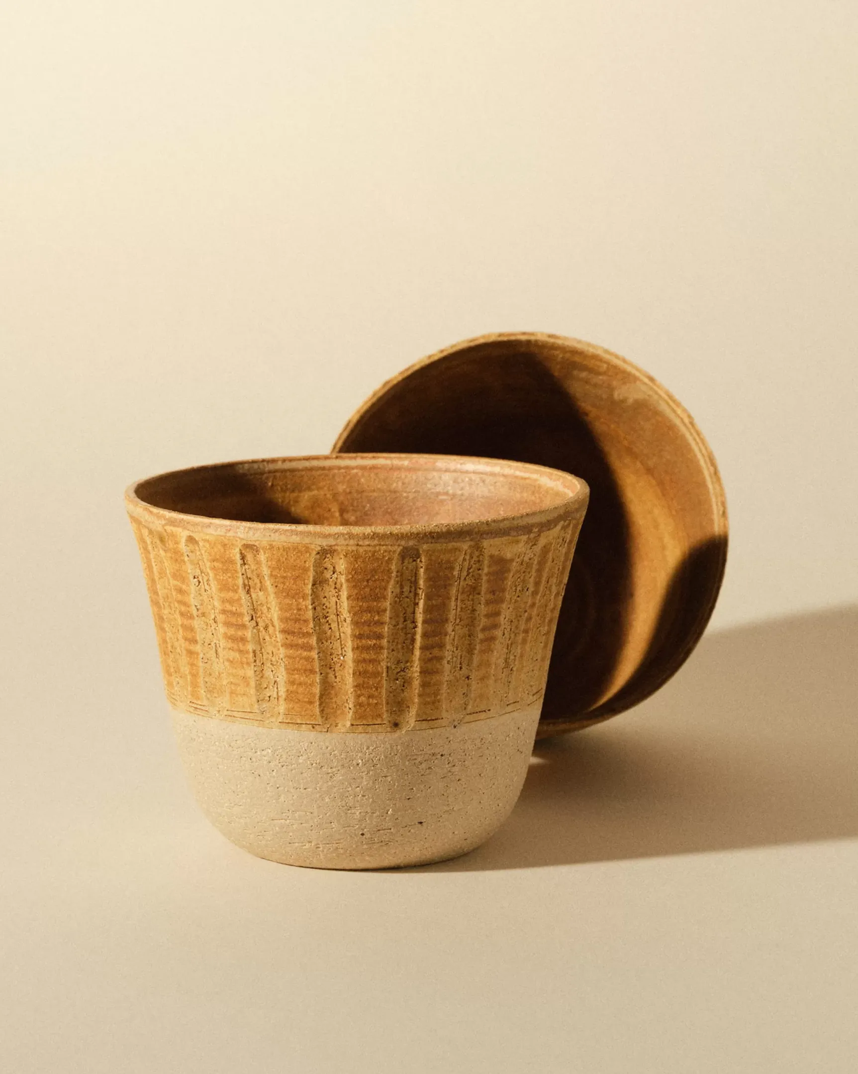 Tasse en terre chamottée cannelée et émaillée.