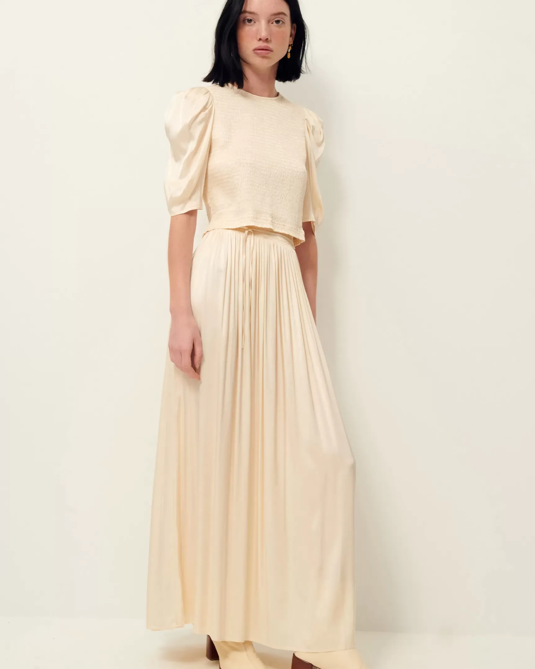 Top court entièrement smocké, manches ballon, en satin fluide.