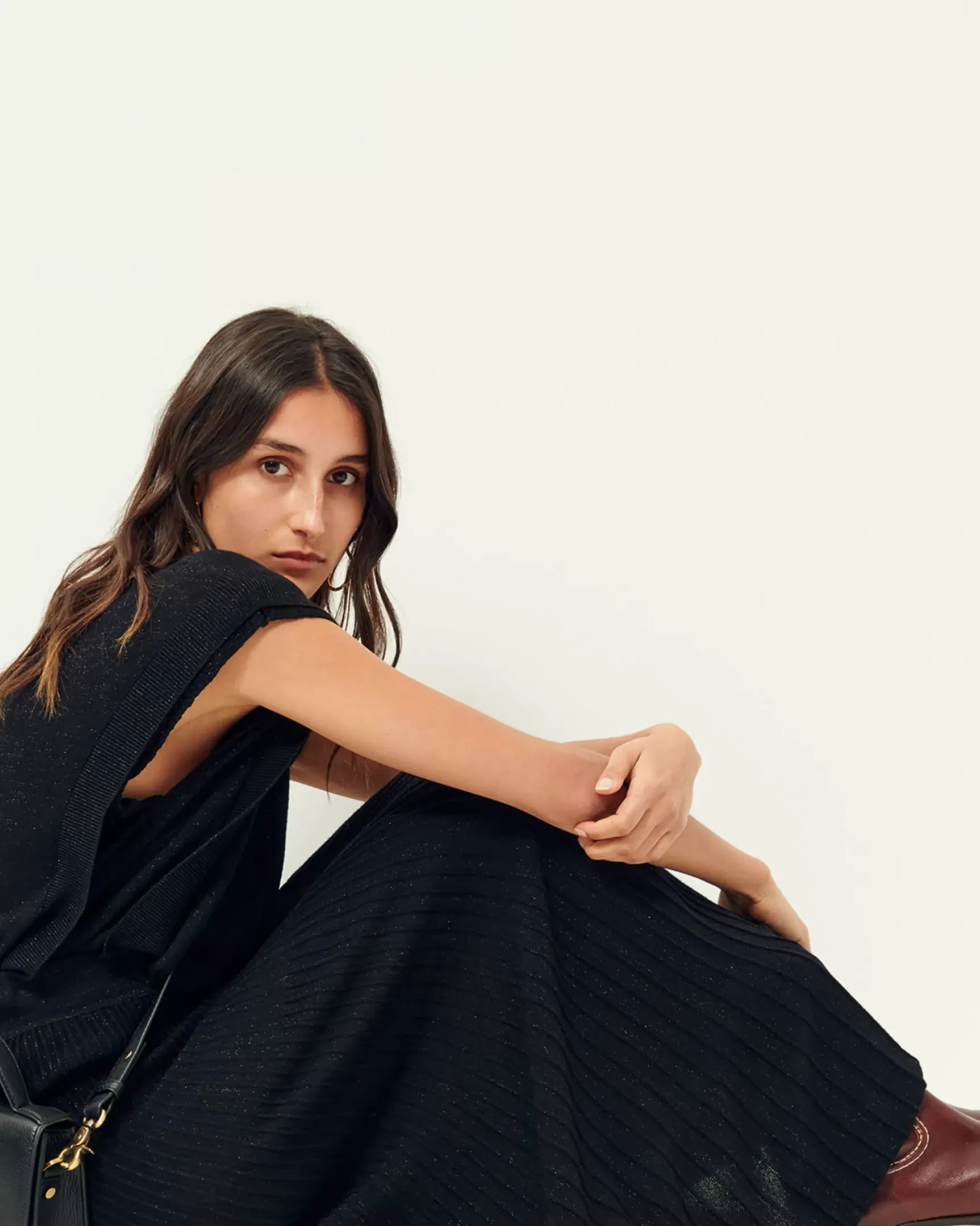 Jupe longue effet plissé soleil en maille jersey métallisée tricotée en Italie.