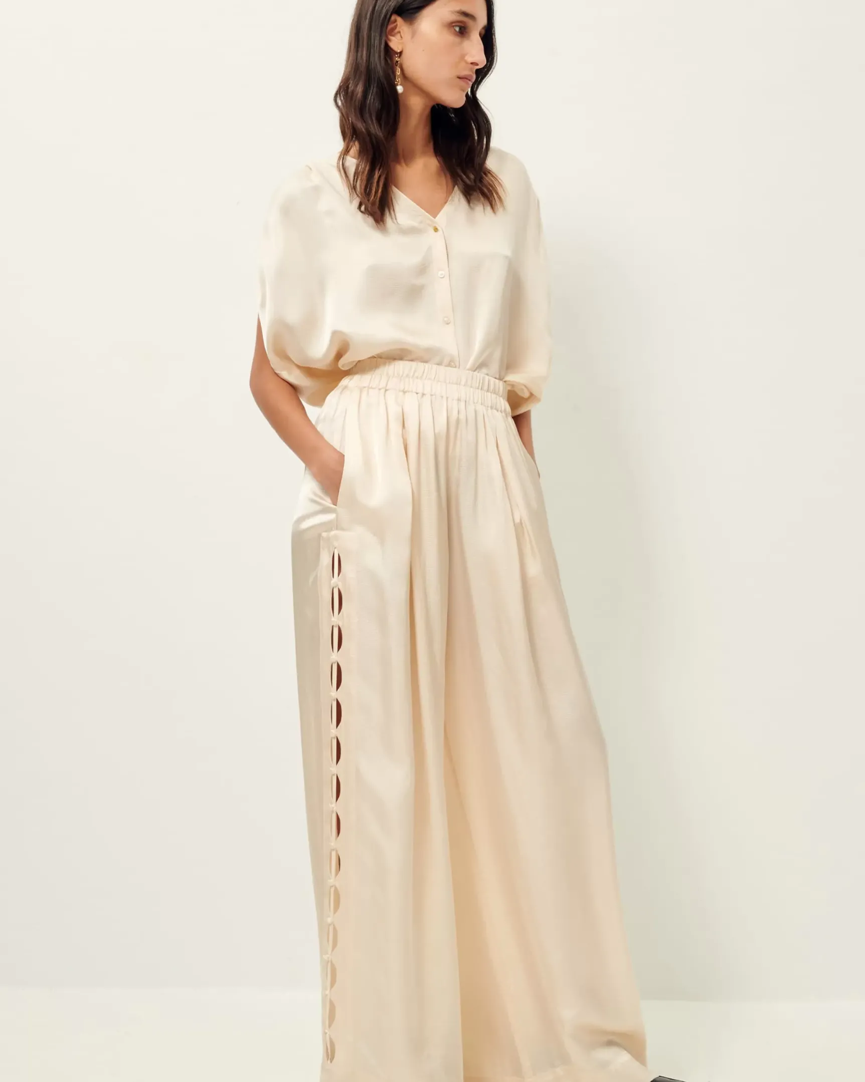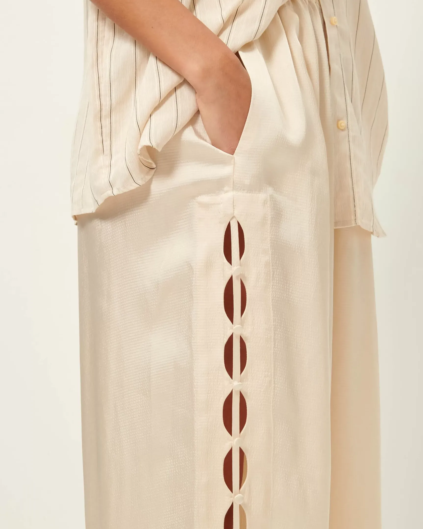 Pantalon ample à la taille élastiquée en satin de viscose seersucker.
