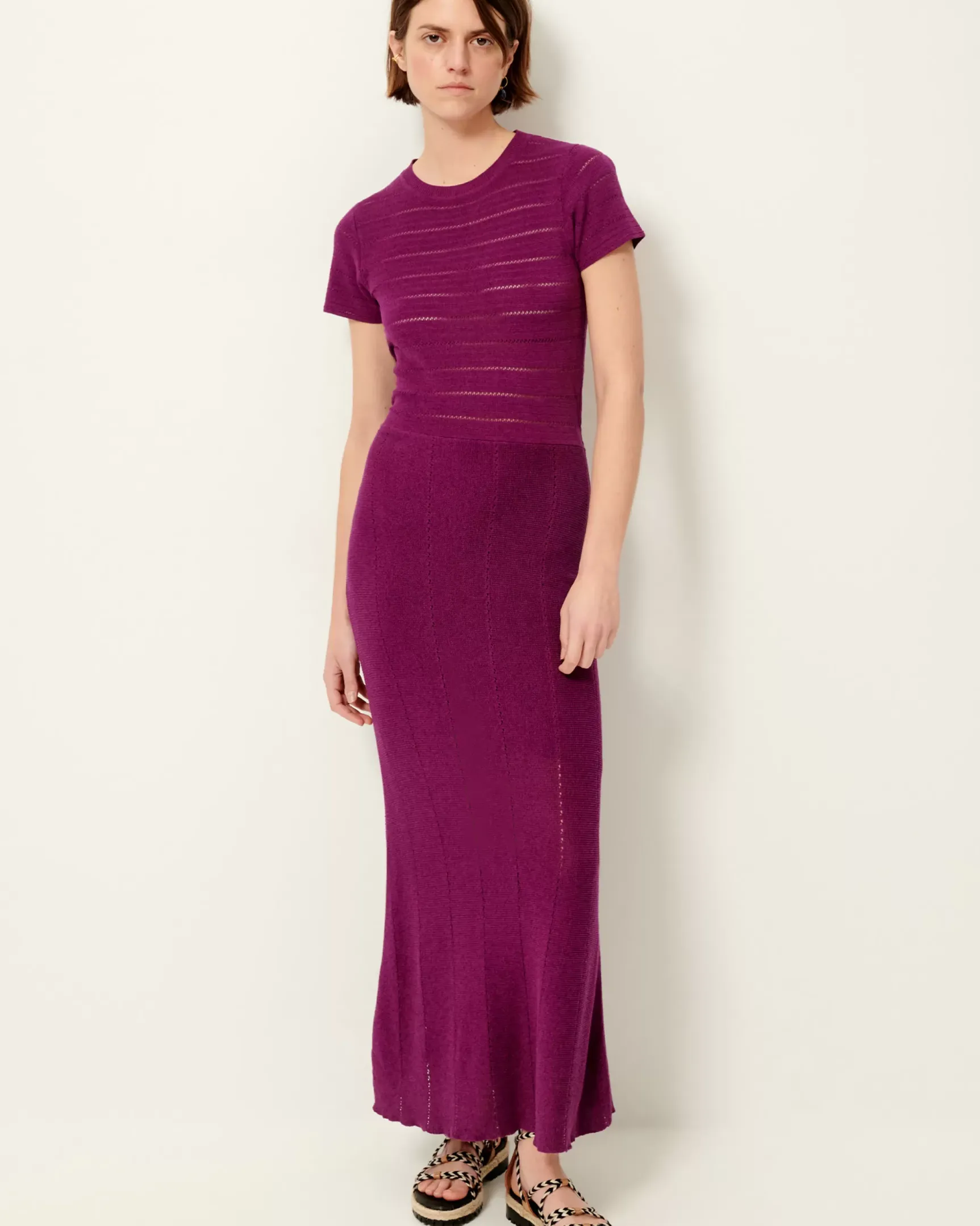 Robe longue à dos nu torsadé en maille fine ajourée.