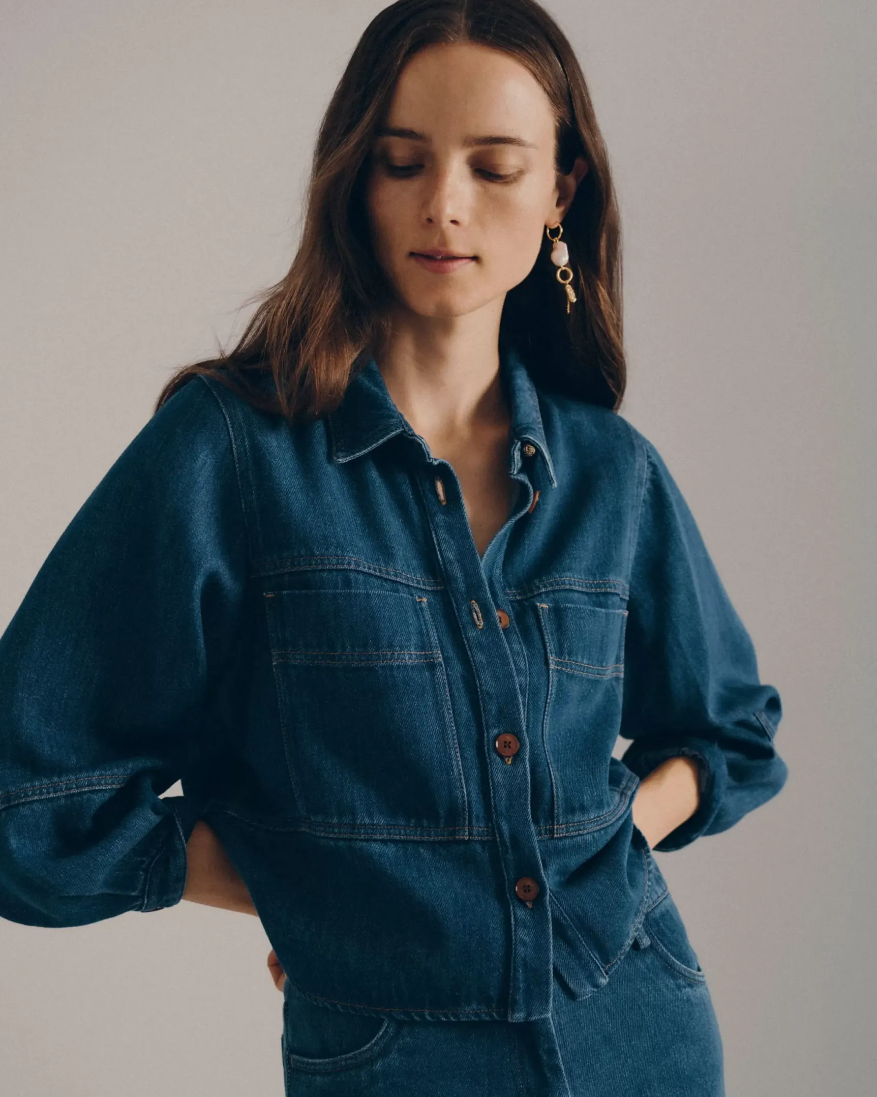 Surchemise à manches ballon en denim fluide stonewashé, tissée en Espagne.