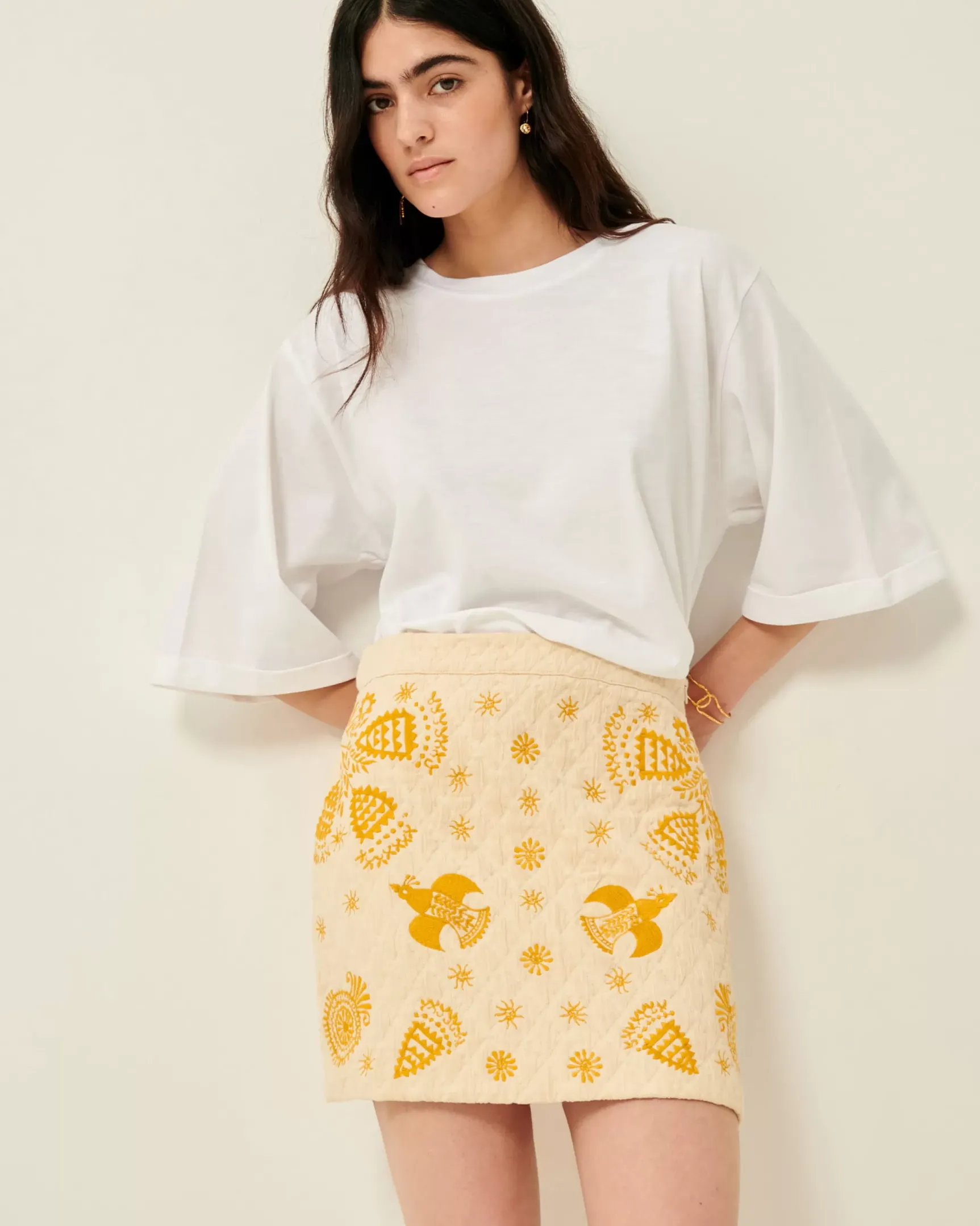 Mini jupe en tissage jacquard armuré effet matelassé, illustrations brodées colorées, motif exclusif Sessùn.