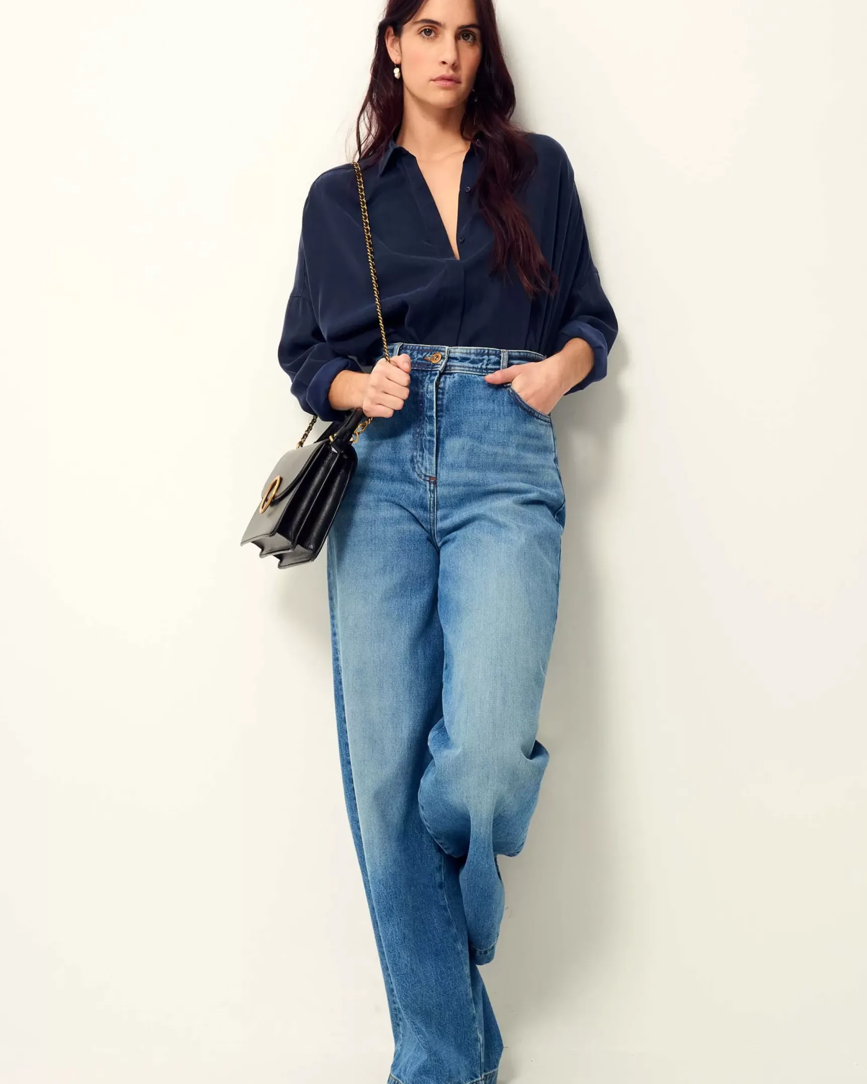 Fermeture boutonnée sous patte et un bouton bijou au pied de col.