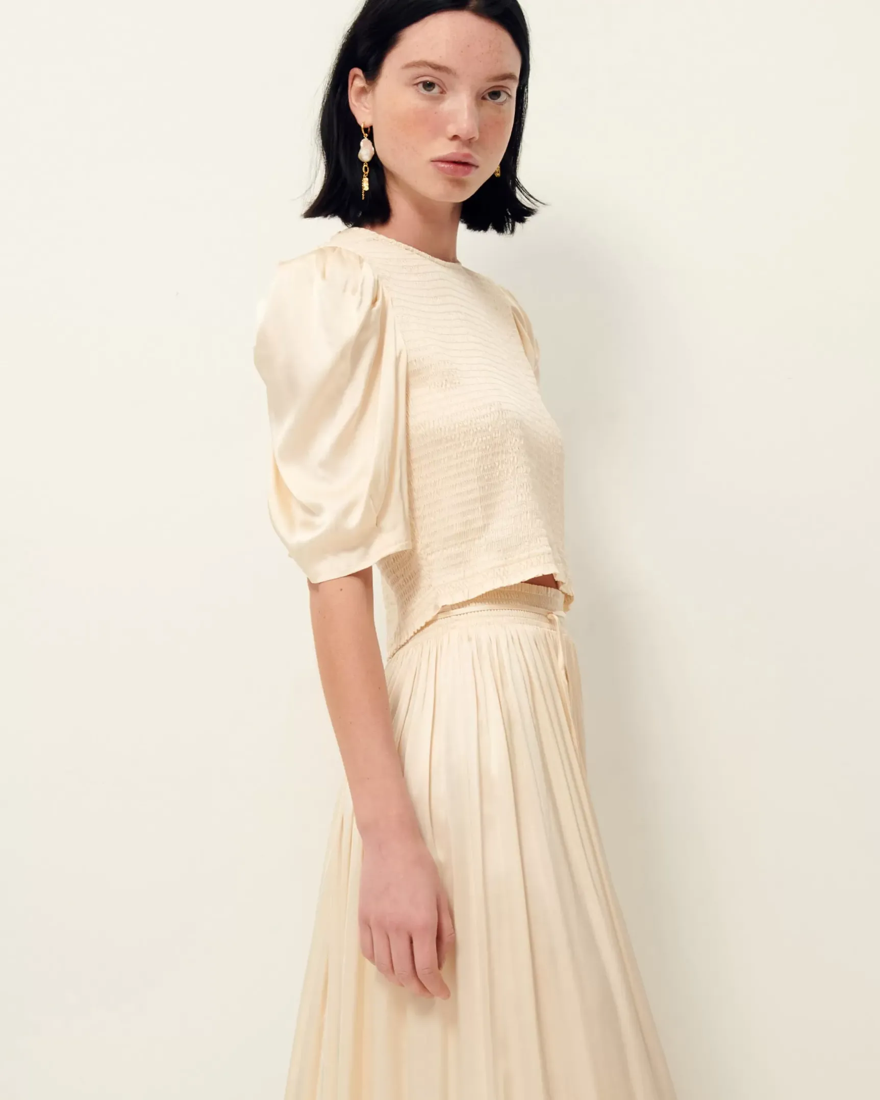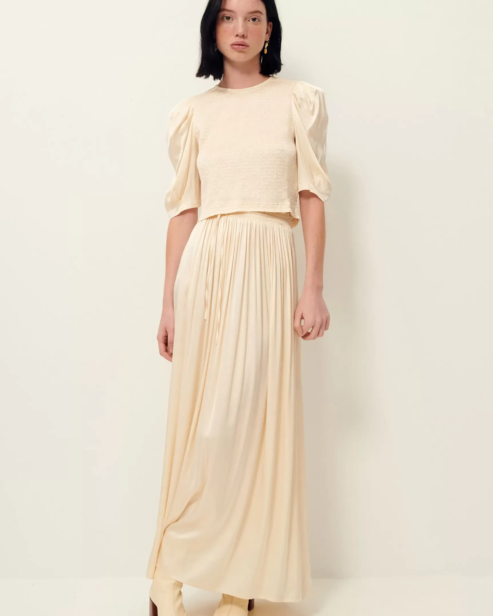 Jupon mi-long smocké en satin fluide.