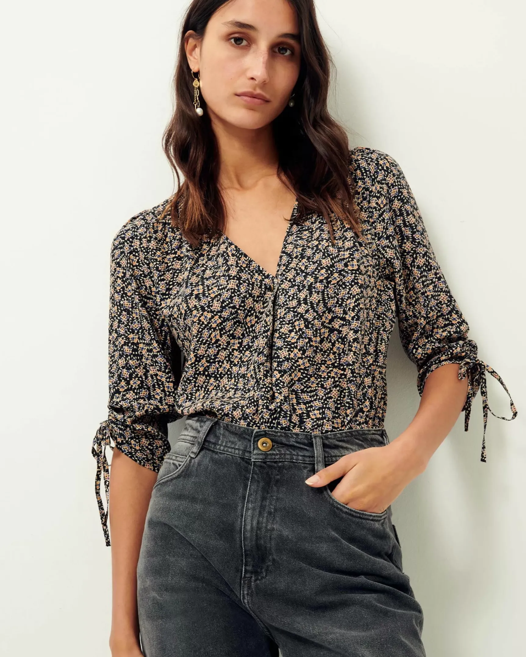Blouse décolleté en V à liens en crépon de viscose imprimé tissé en Italie, motif exclusif Sessùn.