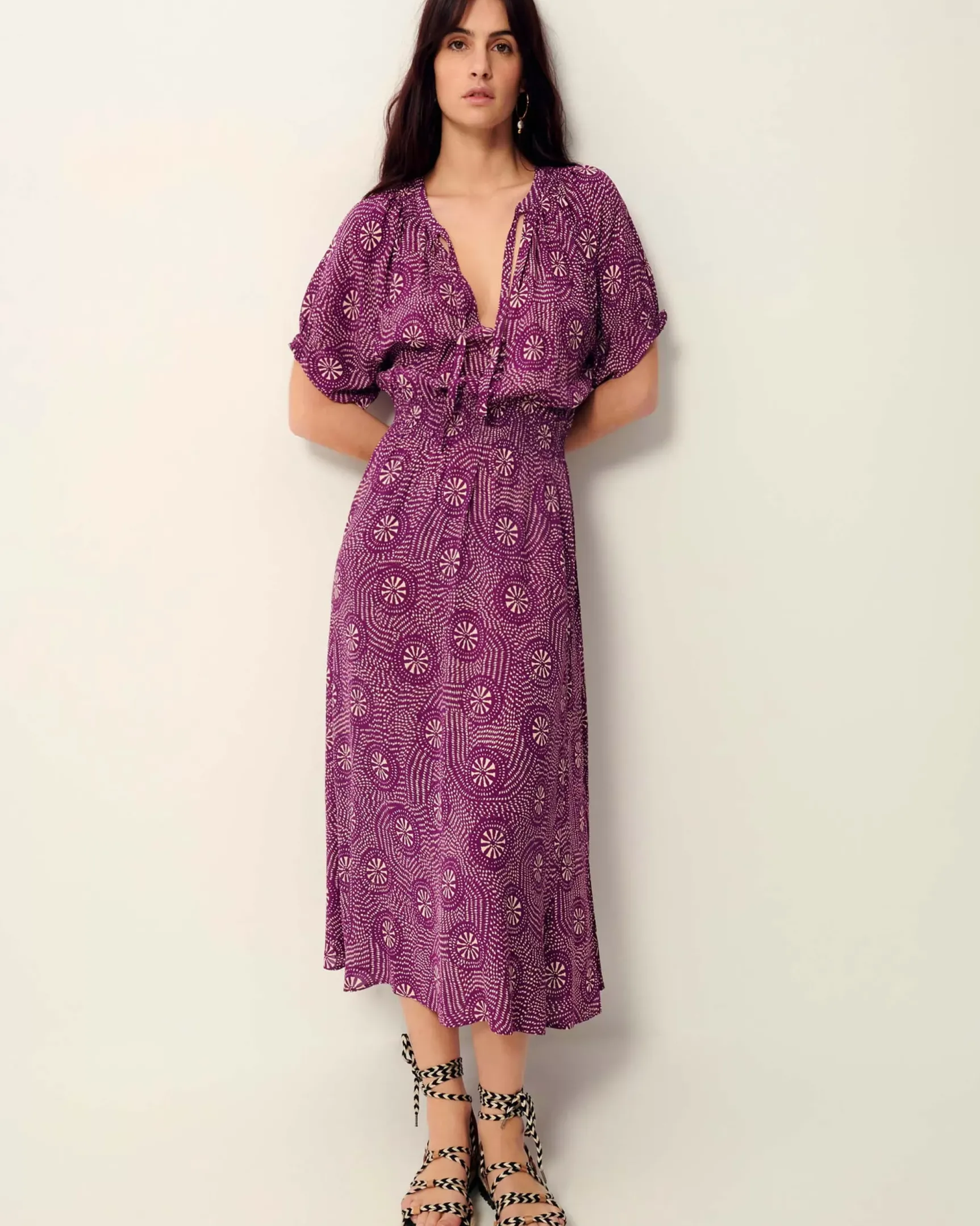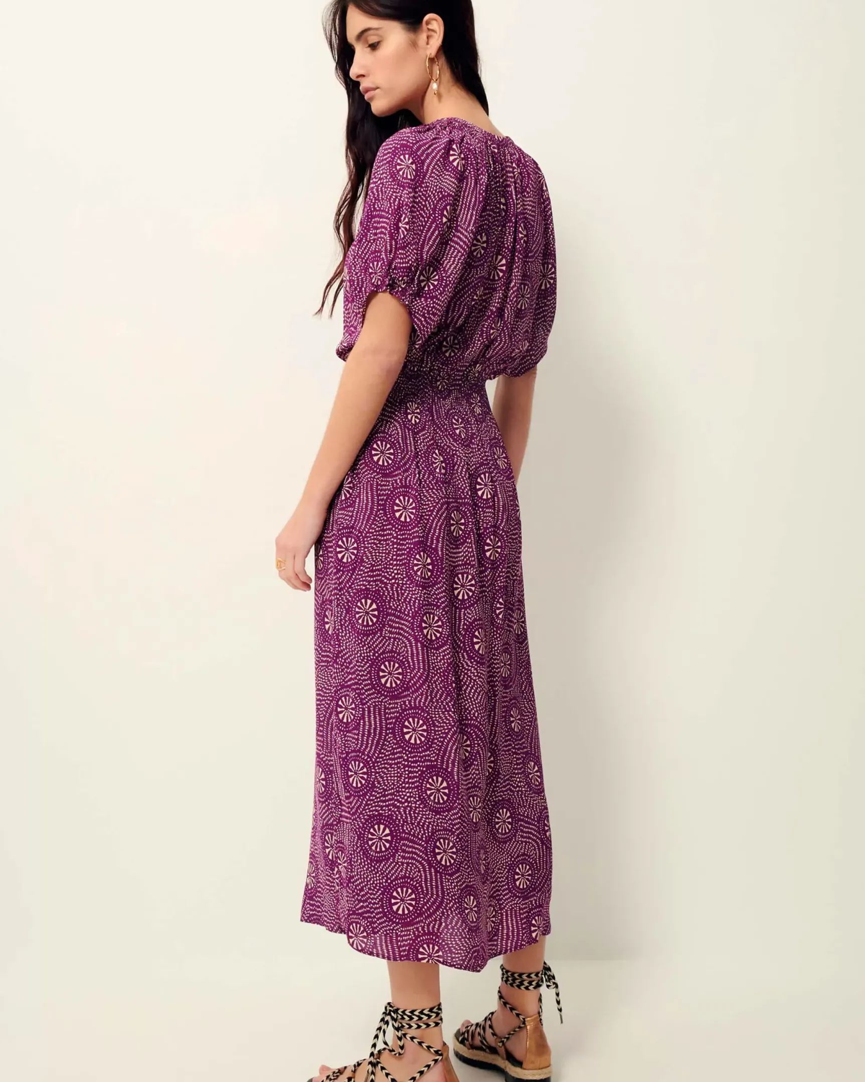 Robe longue à la taille smockée en toile de viscose fluide et aérienne imprimée, motif exclusif Sessùn.