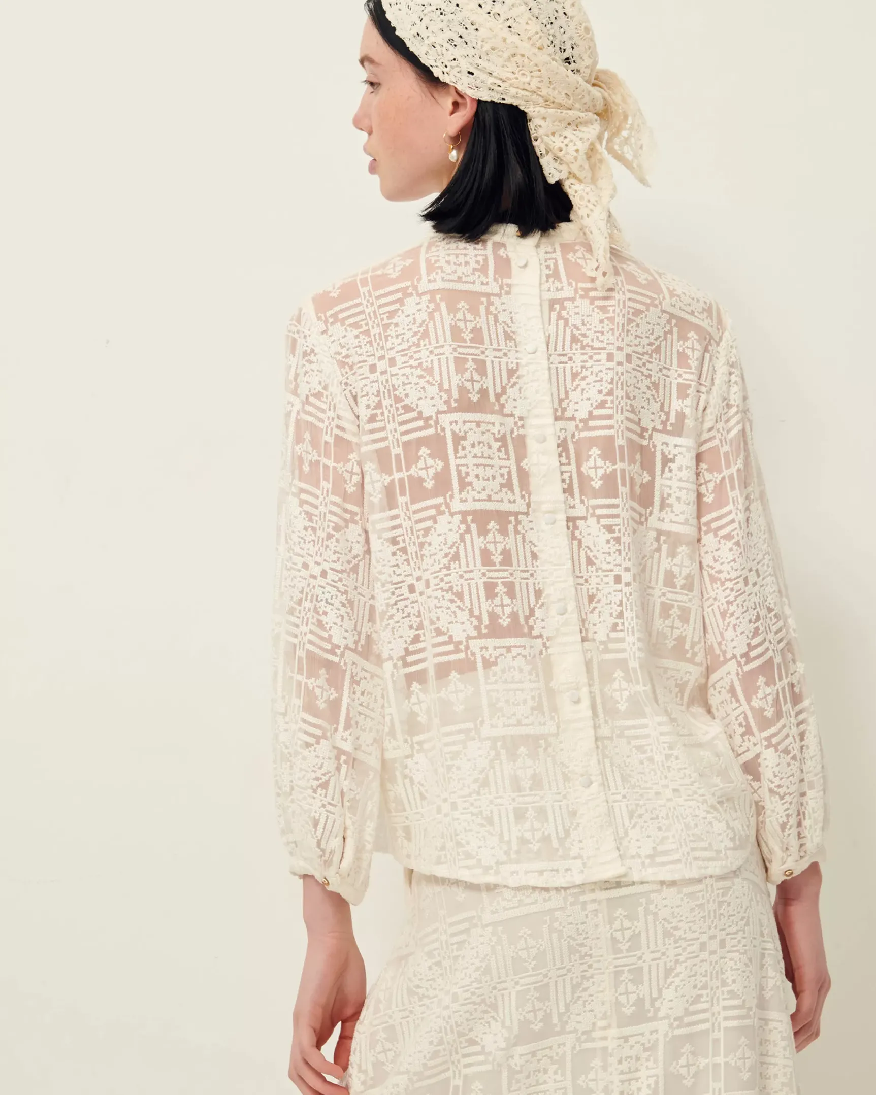 Blouse en mousseline brodée façon point de croix.