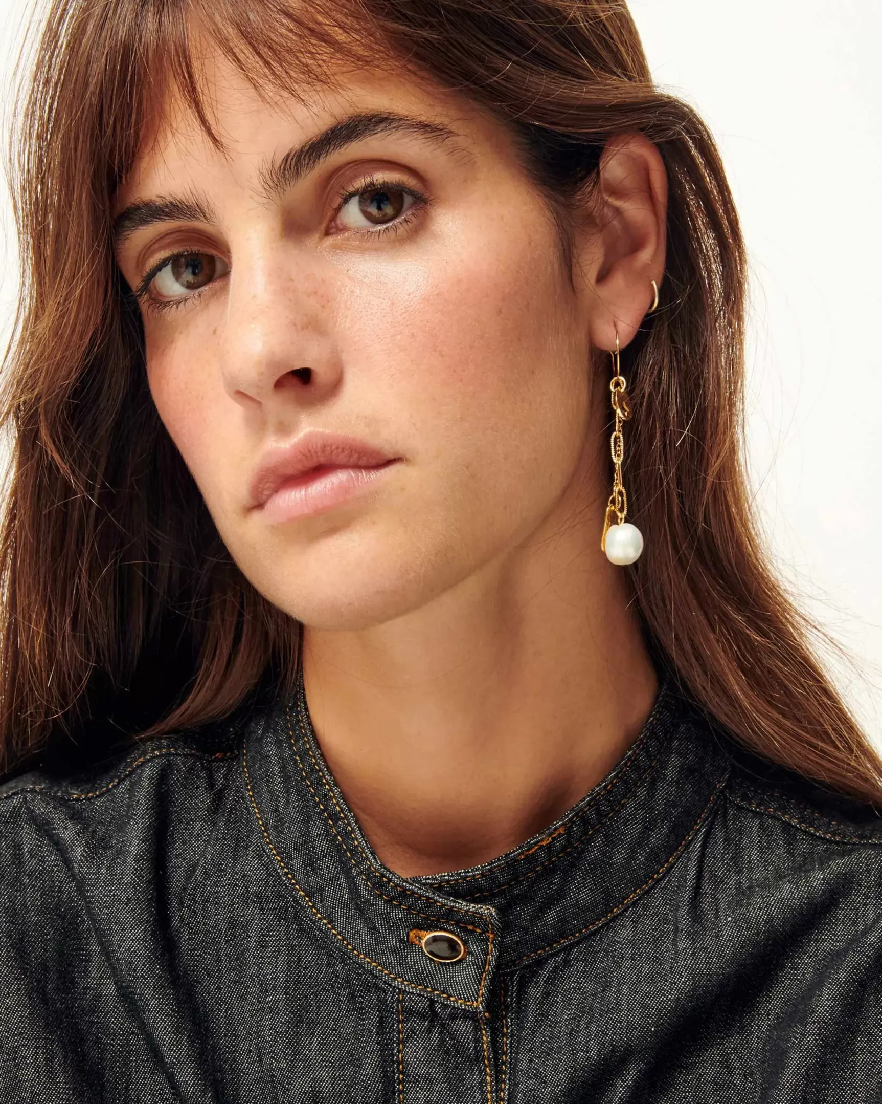 Mono boucle d’oreille fine créole et chaine, avec perle d’eau douce nacrée et médailles.