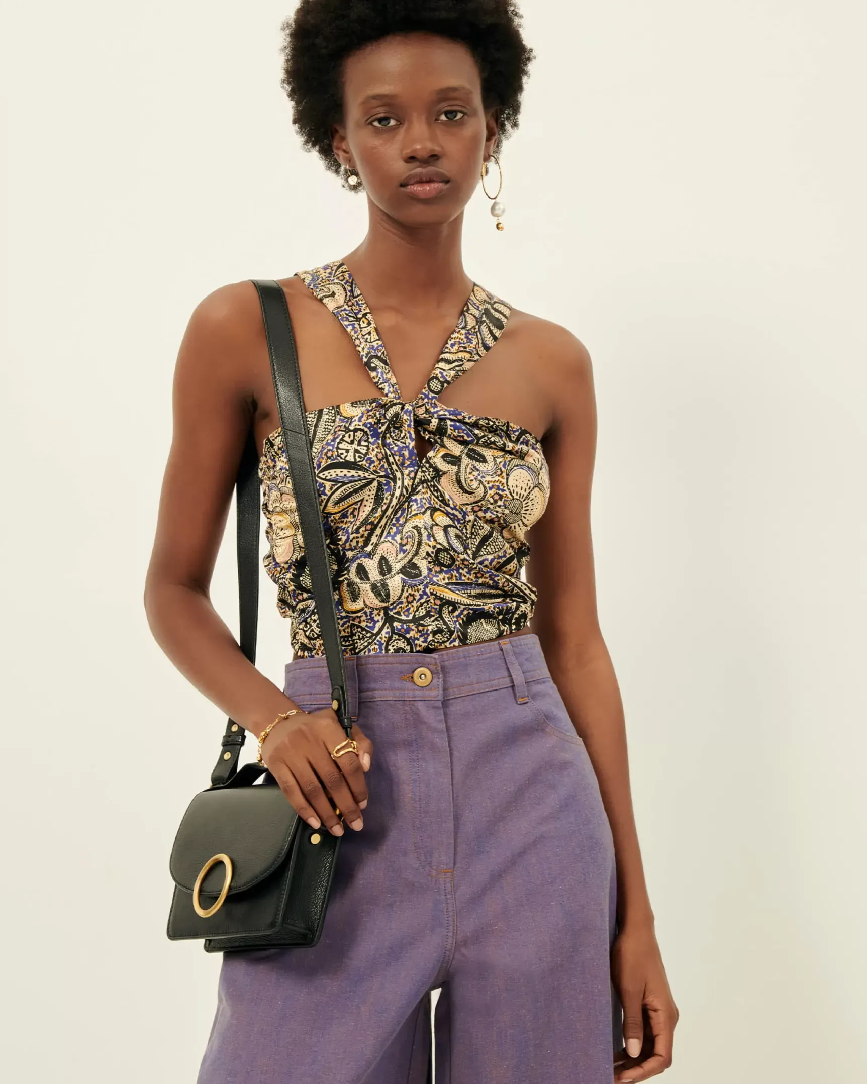 Top court esprit foulard en satin de viscose / soie fluide imprimé apprêté en Italie, motif exclusif Sessùn.